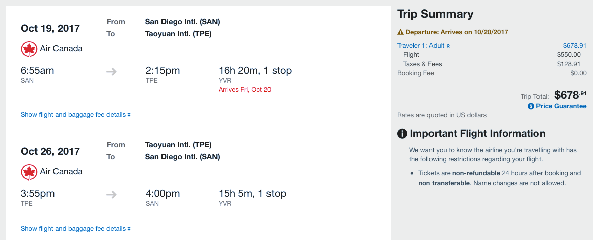 San Diego (SAN) to Taipei (TPE) for $679 round-trip via Orbitz: