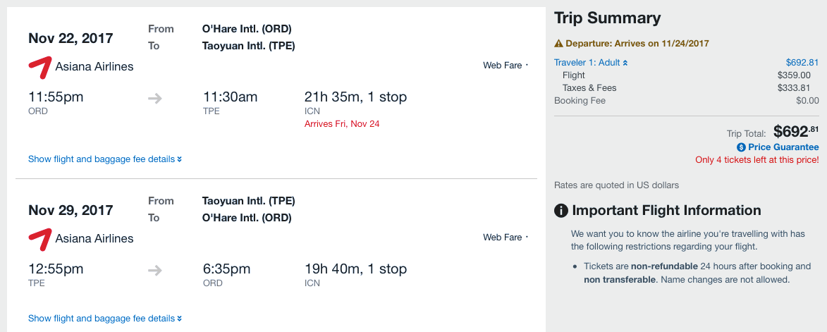 Chicago (ORD) to Taipei (TPE) for $693 round-trip via Orbitz: