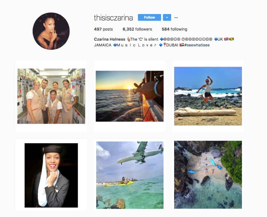 Czarina is currently based in Dubai (DXB) and works as a flight attendant for Emirates, using her Instagram to give followers a glimpse into her world. She travels so much that her boyfriend recently proposed to her while they were in Fiji. One of her favorite things to do is to use drones to take aerial shots of her vacations. She's captured some amazing photos in places like Aruba, Saint Martin and the Dominican Republic.
