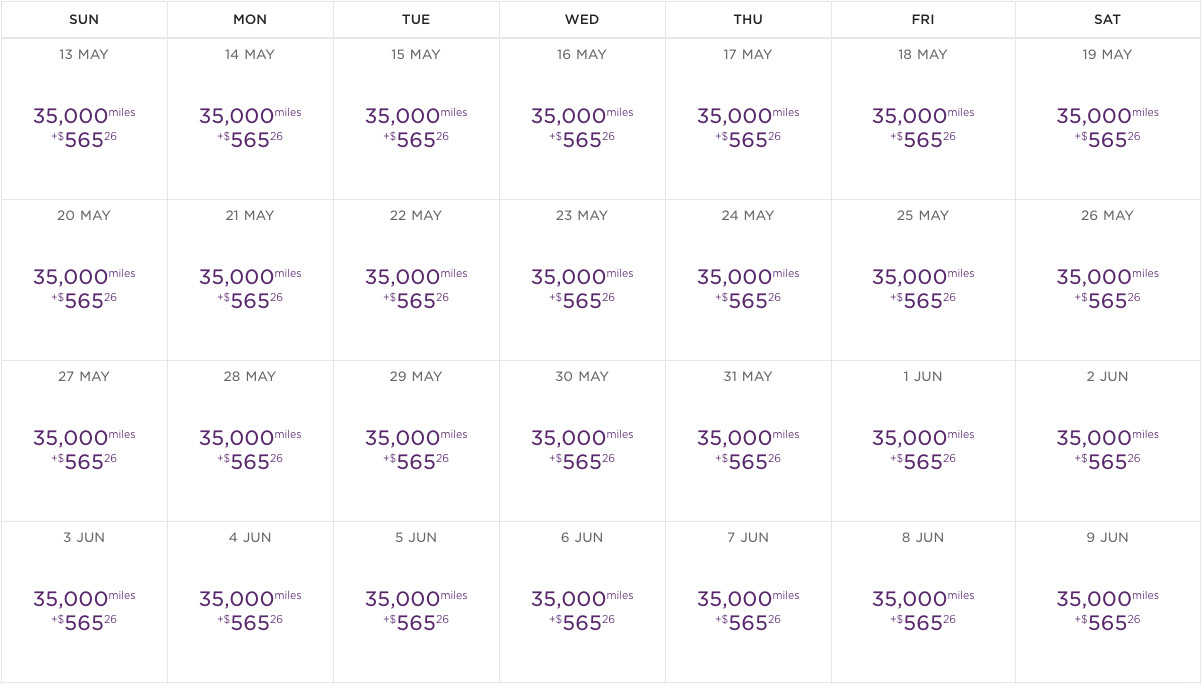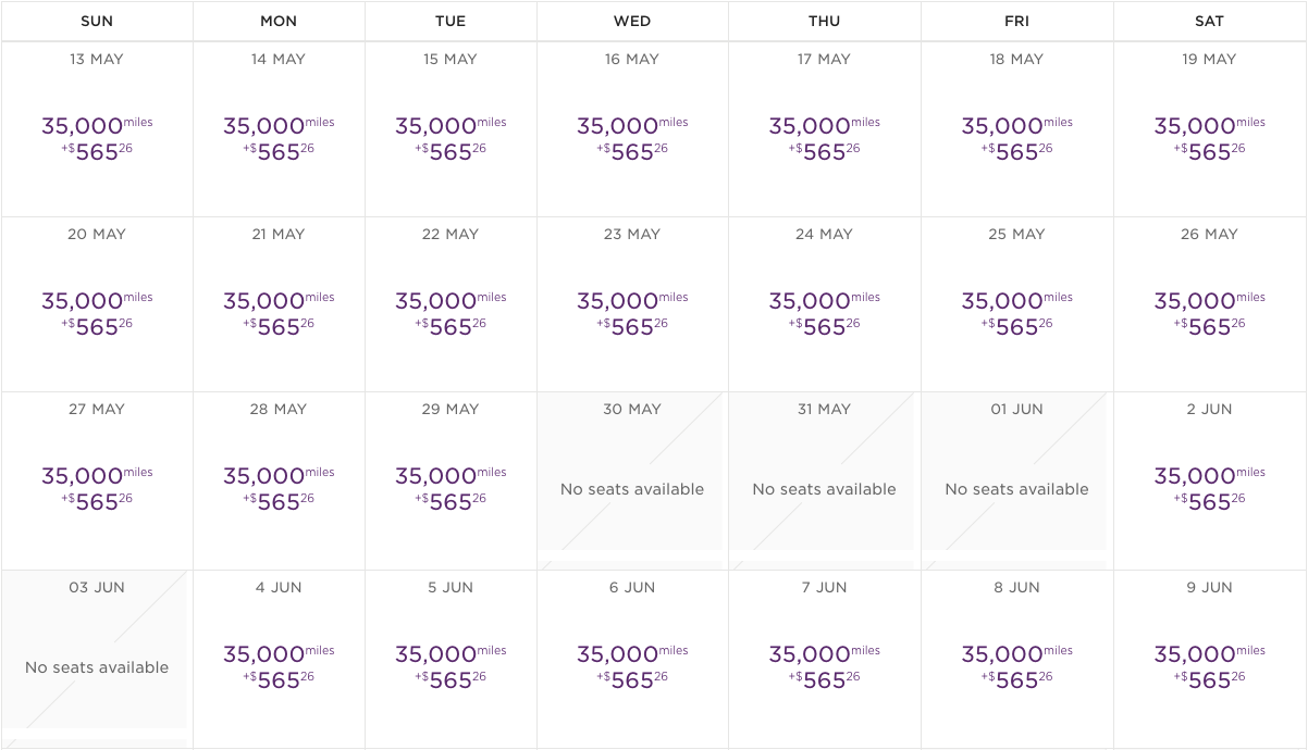 In addition, if you book in advance, availability is quite plentiful. Here's a calendar view when you search for two award seats from the New York area for next May/June:
