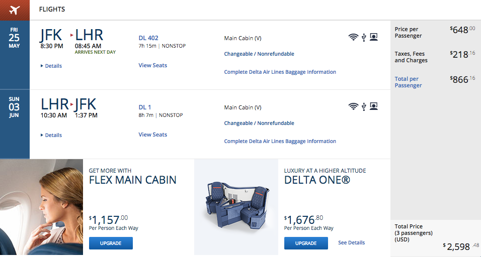 Here's a quick example of how this will work. Let's say you were wanting to fly from New York (JFK) to London-Heathrow (LHR) next Memorial Day on the same dates I used above. Virgin Atlantic has numerous flights with award availability for three travelers, but these flights would set you back 20,000 miles plus $463.66 in taxes and fees. However, Delta operates this same route and has low-level economy tickets for three passengers on the same dates (ignore the number of miles, as that's what Delta would charge):