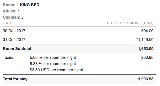 For an extreme example, let's consider New Year's Eve in Times Square in New York City. The DoubleTree Suites is (believe it or not) selling rooms for $3,599 for that one night! Incredibly enough, the program is allowing award redemptions for that night at 95,000 points. With the current bonus, you only need to transfer 48,000 ThankYou points to cover the redemption. When you add in the taxes and fees for the room, you're looking at a total of $4,135.35 when paying cash, an incredible value of 8.6 cents per point.