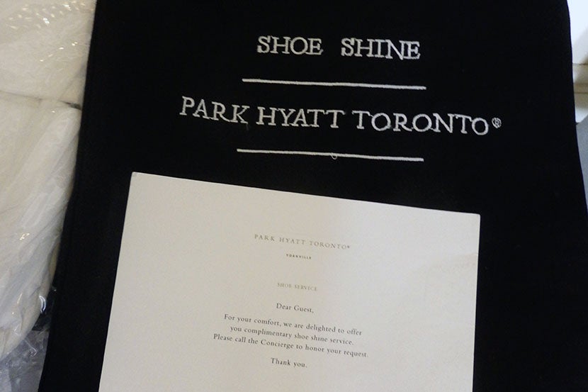 We were happy to see a free shoe shine offered for guests, which we took advantage of. The service was fast and competent. We simply hung shoes in the hotel's shoe bag on a hook outside the door and let the front desk know on our way out that we wanted them back before dinner. They were hanging on our door by the time we returned around 4:00pm.