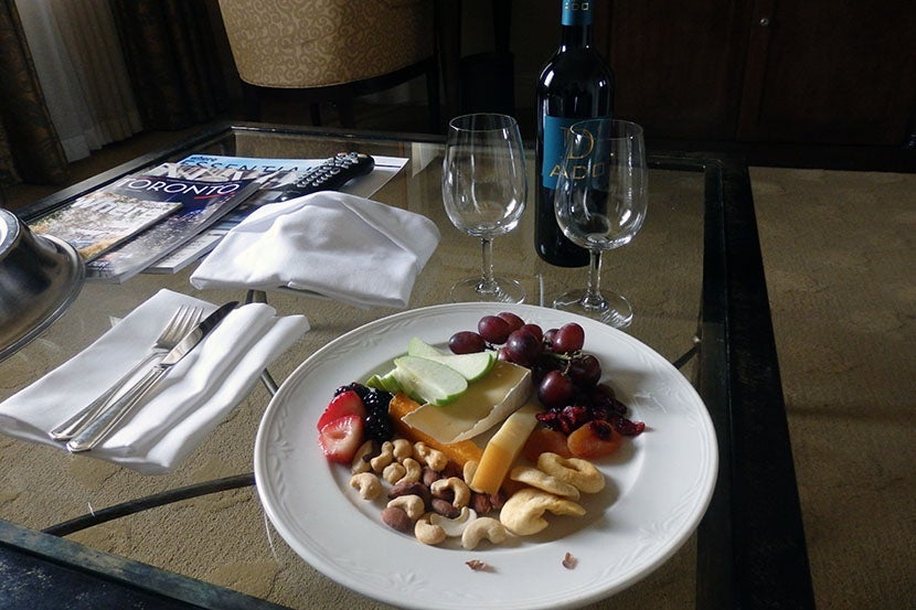 Another advantage of being a World of Hyatt Globalist: The hotel sent up a welcome amenity of cheese and fruit with a bottle of wine — definitely a nice touch, though a standard welcome amenity. It was a lovely snack to enjoy as the sun set and we caught the city views.