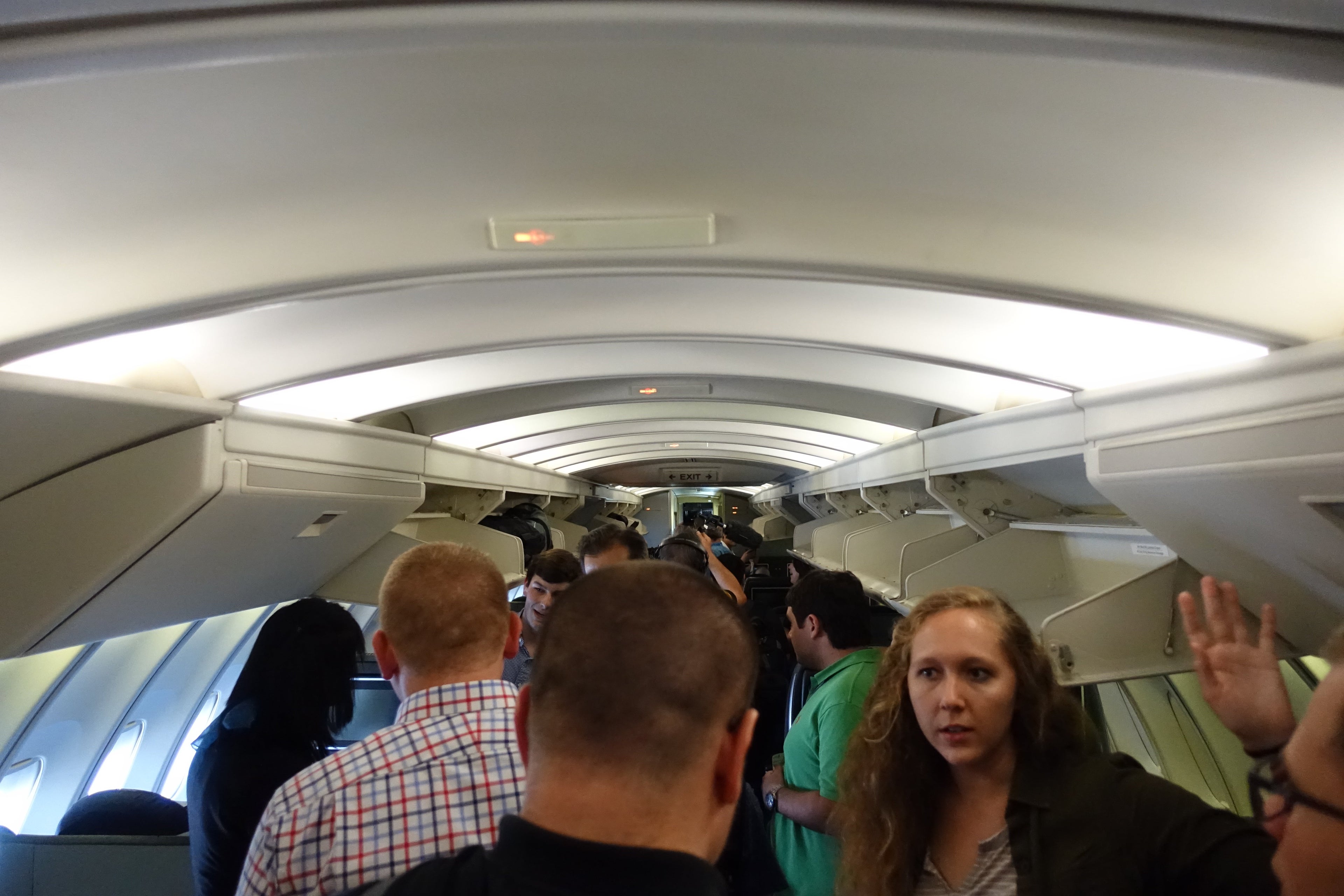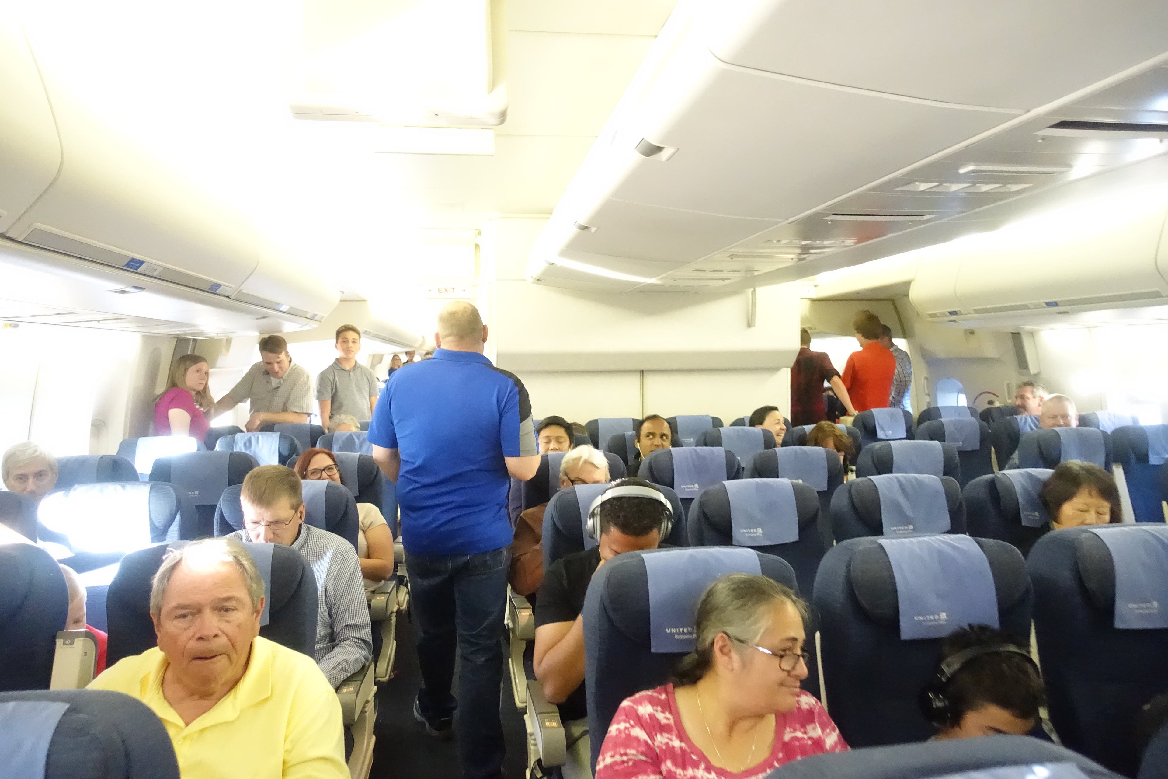 ...to find my window seat in the upper deck, but so many people were flooding the upstairs cabin to take photos in the cockpit, I could barely move! There was a line all the way to the stairs!