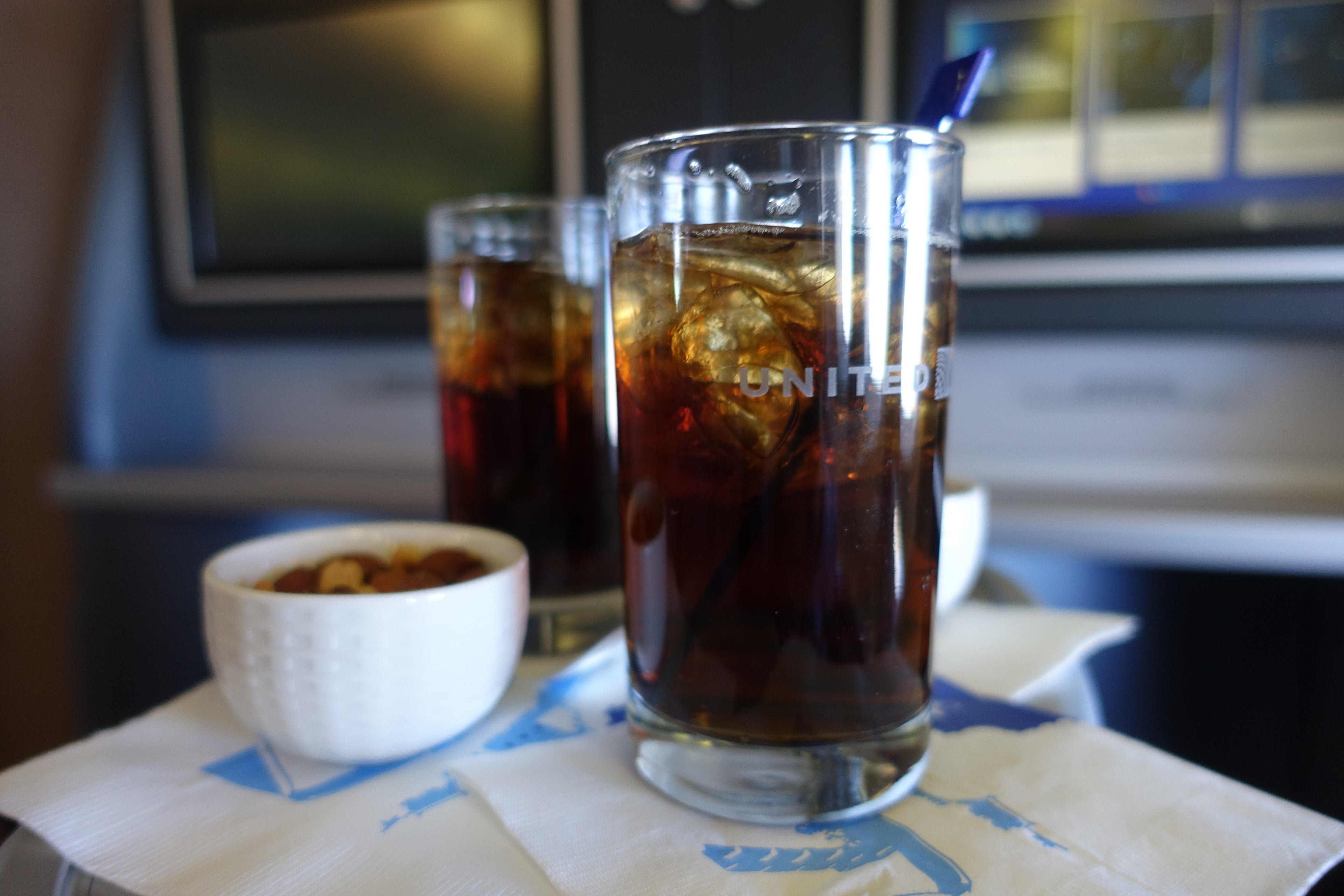 Once we took off and the drink service began, the real party started. I got a Jack and Coke, served with warm nuts in United's Polaris dishware.