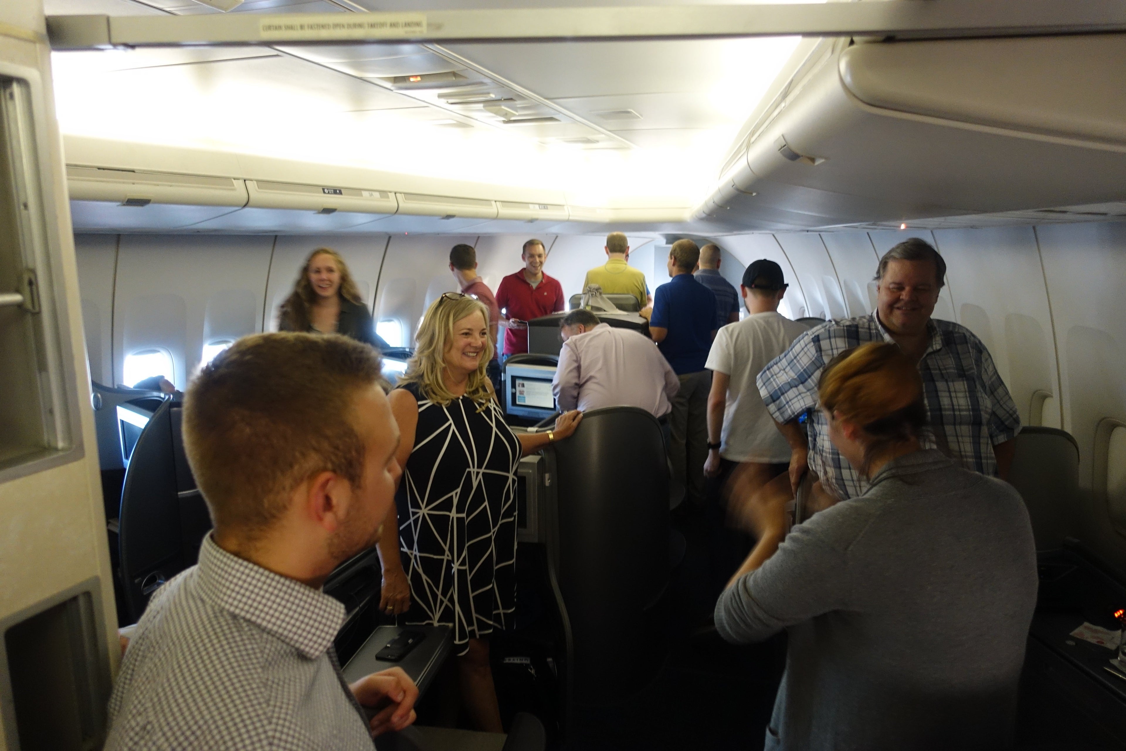 Unlike the dreaded 2-4-2 business class downstairs, the upper deck on the 747 is arranged in a 2-2 configuration. In fact, the infamous lack of privacy in United's 747 business class product was perfect for the festivities. Passengers were up and about, introducing themselves to each other.