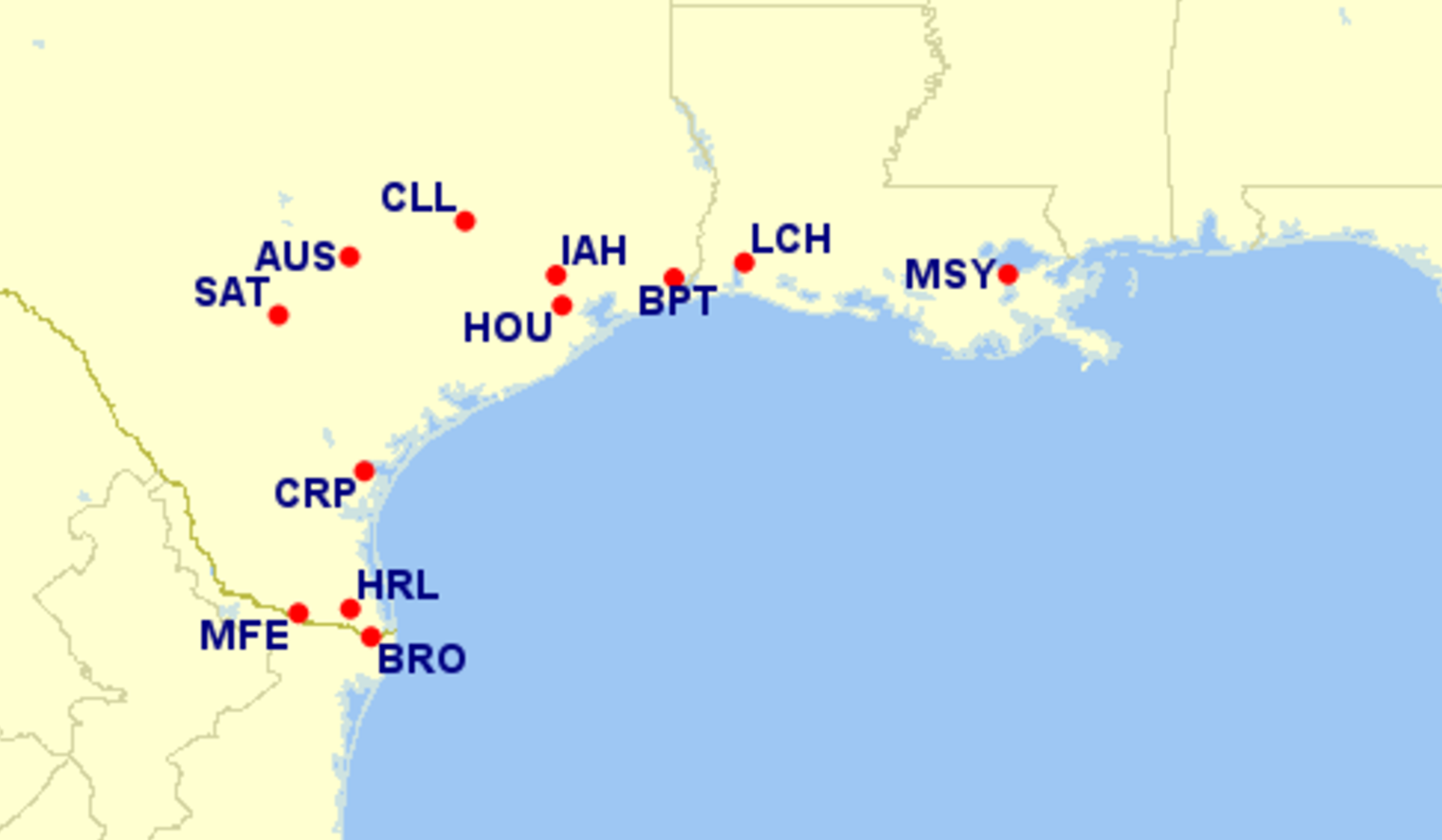 • Airports affected: Austin (AUS), Houston (IAH), San Antonio (SAT)