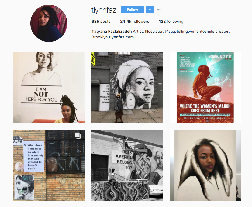 Tatyana Fazlalizadeh, originally from Oklahoma City, is an artist and illustrator based in Brooklyn. In 2015, she was featured as one of Forbes 30 Under 30 in Art and Style for addressing themes such as sexual harassment and the Arab Spring in her art. Her public art series can be found not only on walls but also at galleries and museums in Arizona, Texas, Chicago, Detroit, Philadelphia and Los Angeles.