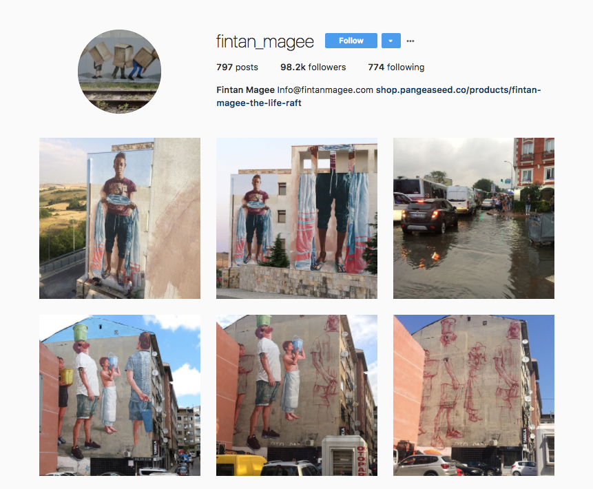 Fintan Magee is a street artist from Australia known for designing grand murals that encompass entire buildings. After earning a fine arts degree, he moved to Sydney and began painting scenes that highlight broad issues like climate change and the migrant crisis. One such painting in Italy depicts a man with his head encapsulated in a glass of water, a tribute to rising sea levels. He gets around, too, with projects featured in London, Vienna, Los Angeles, Moscow and Oslo.