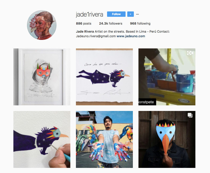 Jade Rivera is an artist based in Lima, Peru, whose curiosity for art began as an 11-year-old, when he began devoting more time for drawing and painting. Primarily self-taught, his murals are often colorful pieces heavily influenced by Andean culture and can be found across Latin America from Costa Rica to the Dominican Republic and Paraguay.