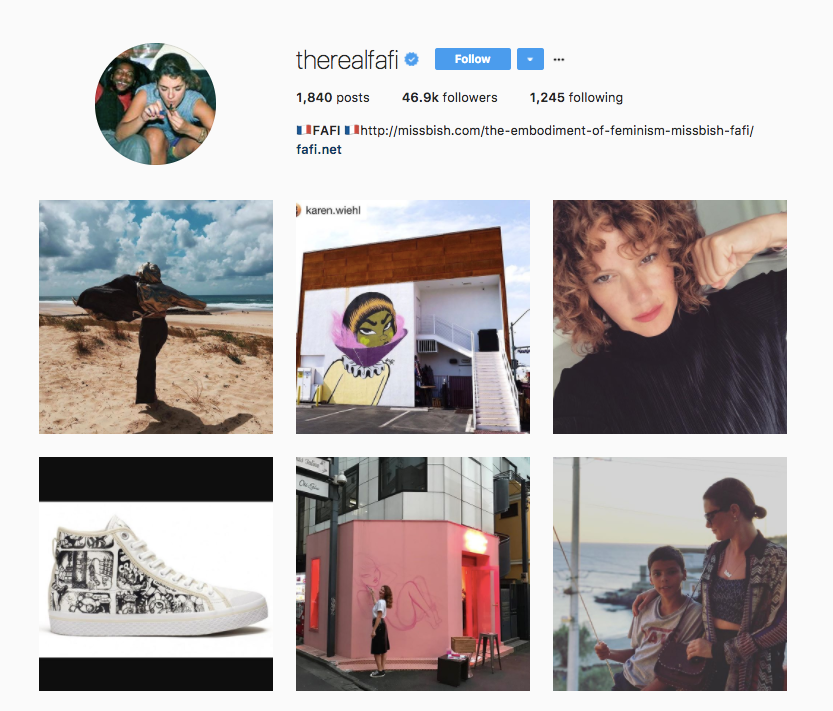 Fafi, originally from Toulouse, is a mononymous French street artist whose foray into the art world began with her drawing in her bedroom as a child, then painting her drawings on the wall once her parents had gone to sleep. Originally known as the creator of a set of sassy street characters dubbed the "Fafinettes," her art has since been used by companies such as Adidas and MAC. Fafi once told Vice: "It's the whole spirit of graffiti that I loved: the crew, the night, the fact that everything was forbidden and the fact that we had to steal the paint. Everything was appealing to a young and adventurous chick like me."