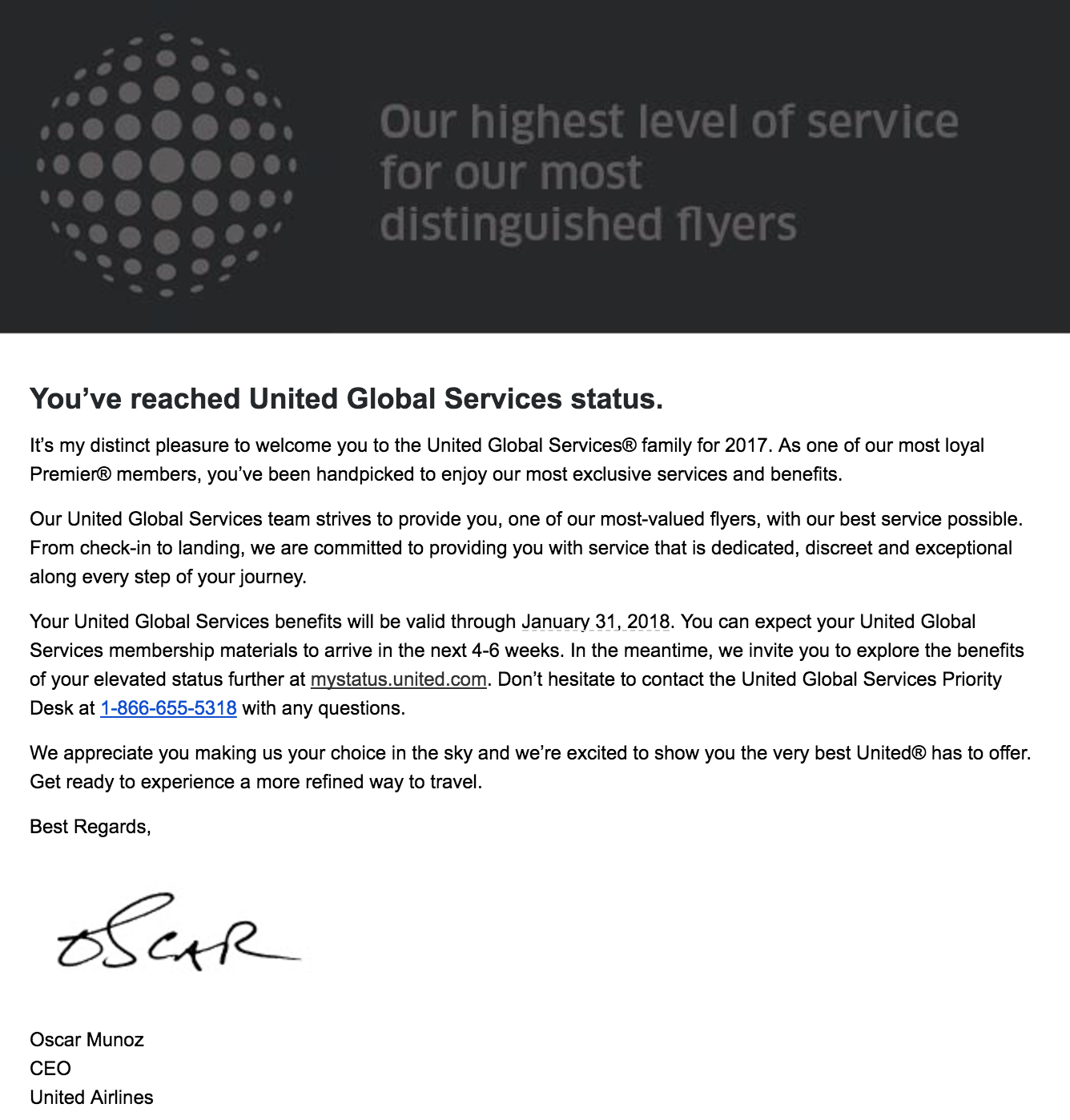 Just as with all US airline status programs, the perks kick in once you achieve the required flying and spend. So if I hadn't earned Premier 1K from my flying in 2016, I'd have it now, since I've reached the requirements for 2017. One thing that makes Global Services unique is the fact that there's no way to know exactly what you need to do to get the nod from UA. That said, United has begun sending out invitations for GS this year, so if you didn't make the cut by December 2016, you have another shot now.