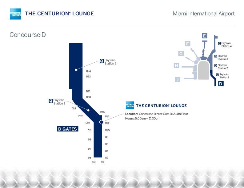You'll find the MIA Centurion Lounge after security in Concourse D near Gate D12. It's also easily accessible from Concourse E since they're connected, but if you're flying in from any other concourse you'll have to go through security a second time. Weary travelers will be happy to know that the lounge is open every day from 5:00am to 11:00pm.