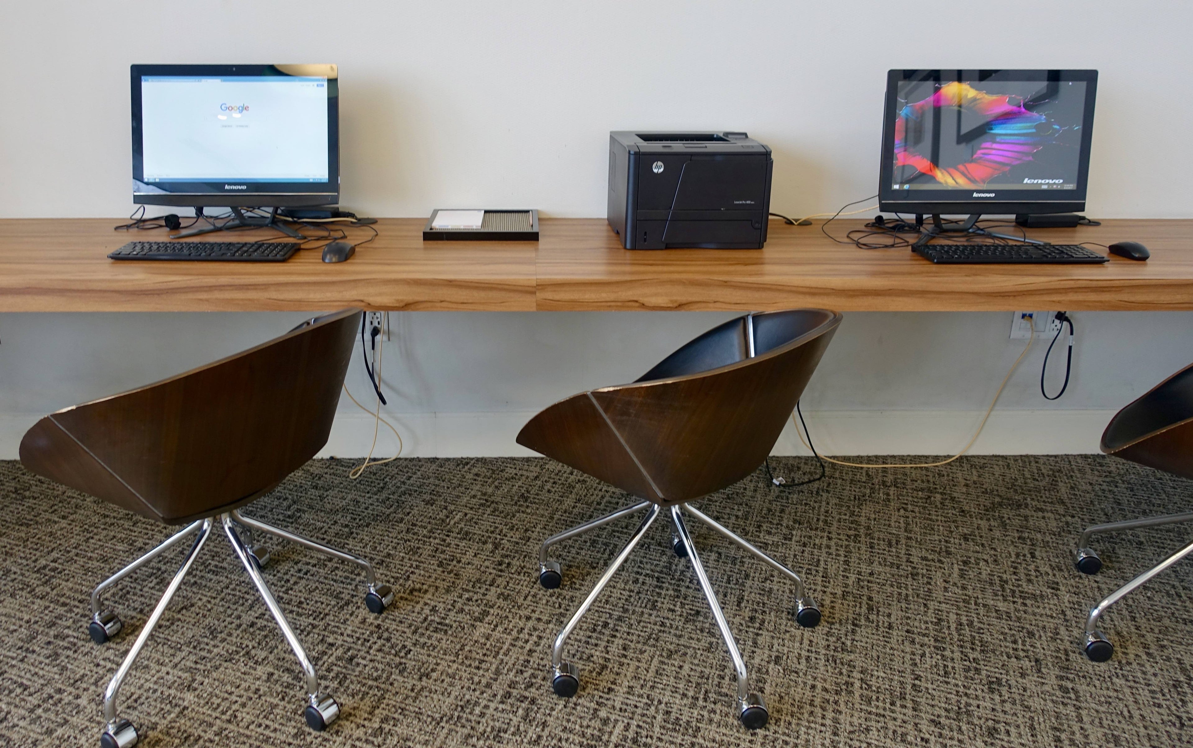 The work area near the large wooden table had two computers and a printer for patrons to use. There was also a family room located near the buffet, where little ones could unwind before a flight.
