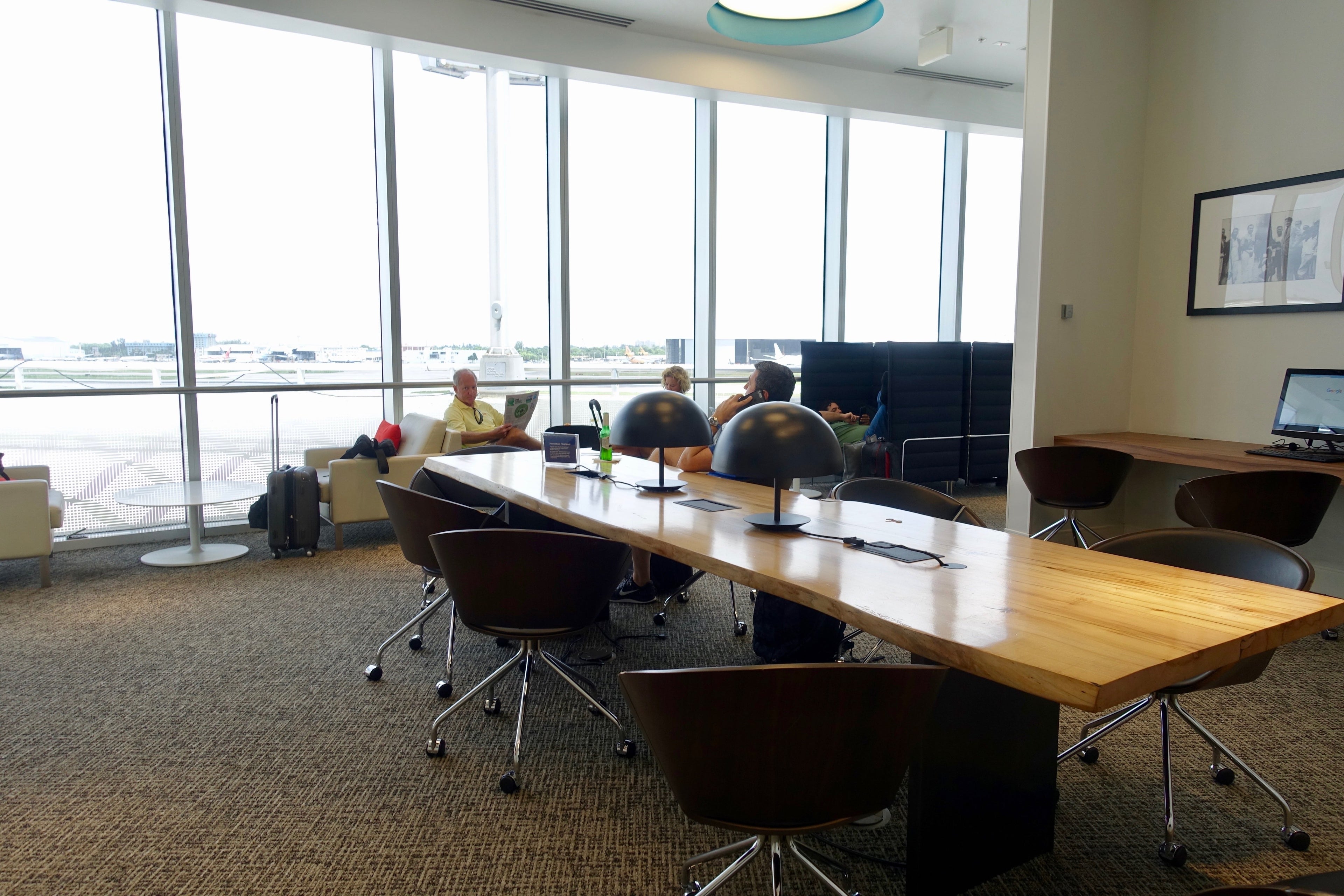I spotted a large communal wooden table like I'd seen in all the other Centurion Lounges, though this one offered incredible views of the tarmac.