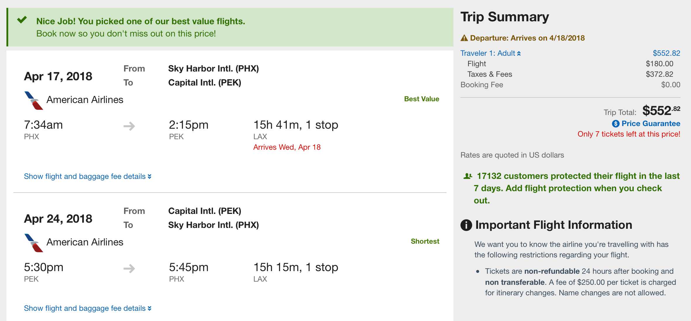 Phoenix (PHX) to Beijing (PEK) for $553 round-trip on American via Orbitz: