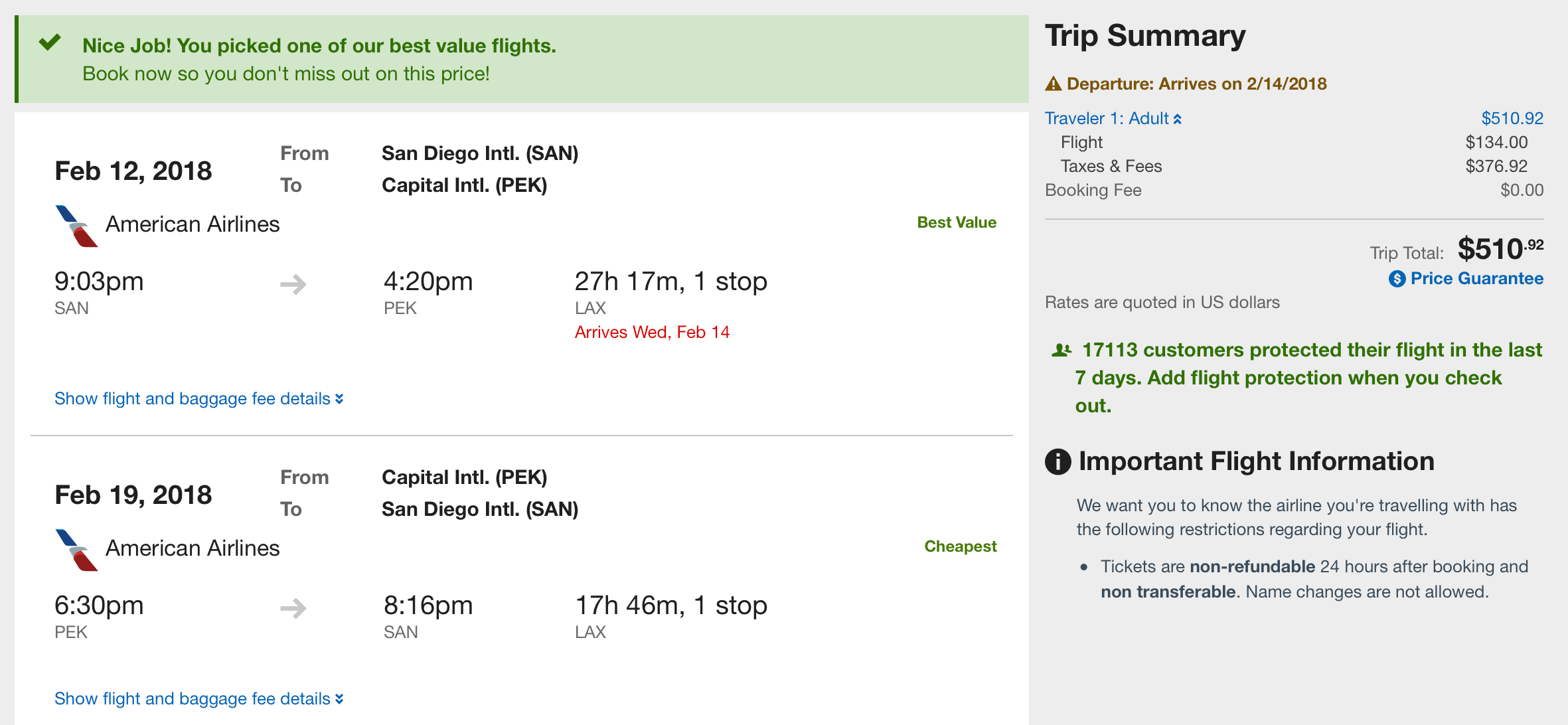 San Diego (SAN) to Beijing (PEK) for $511 round-trip on American via Orbitz: