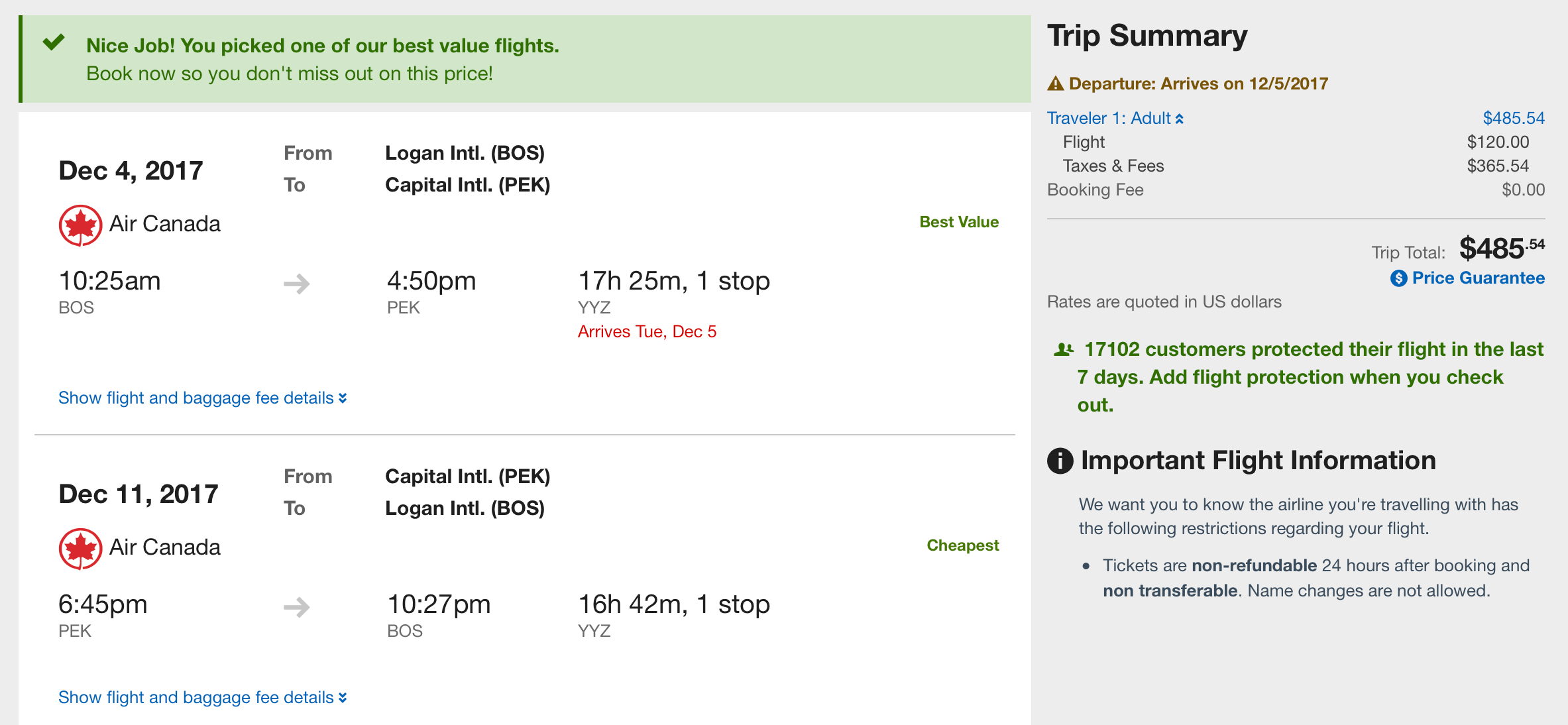 Boston (BOS) to Beijing (PEK) for $486 round-trip on Air Canada via Orbitz: