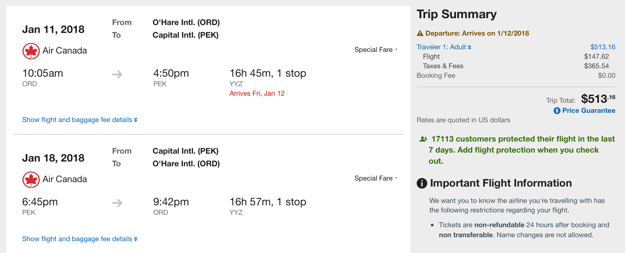 Chicago (ORD) to Beijing (PEK) for $513 round-trip on Air Canada via Orbitz: