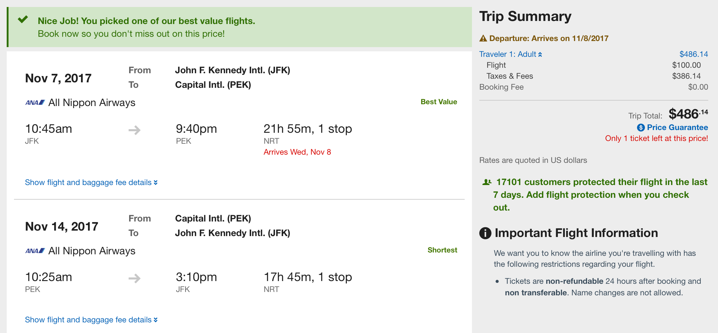 New York City's JFK to Beijing (PEK) for $486 round-trip on ANA via Orbitz:
