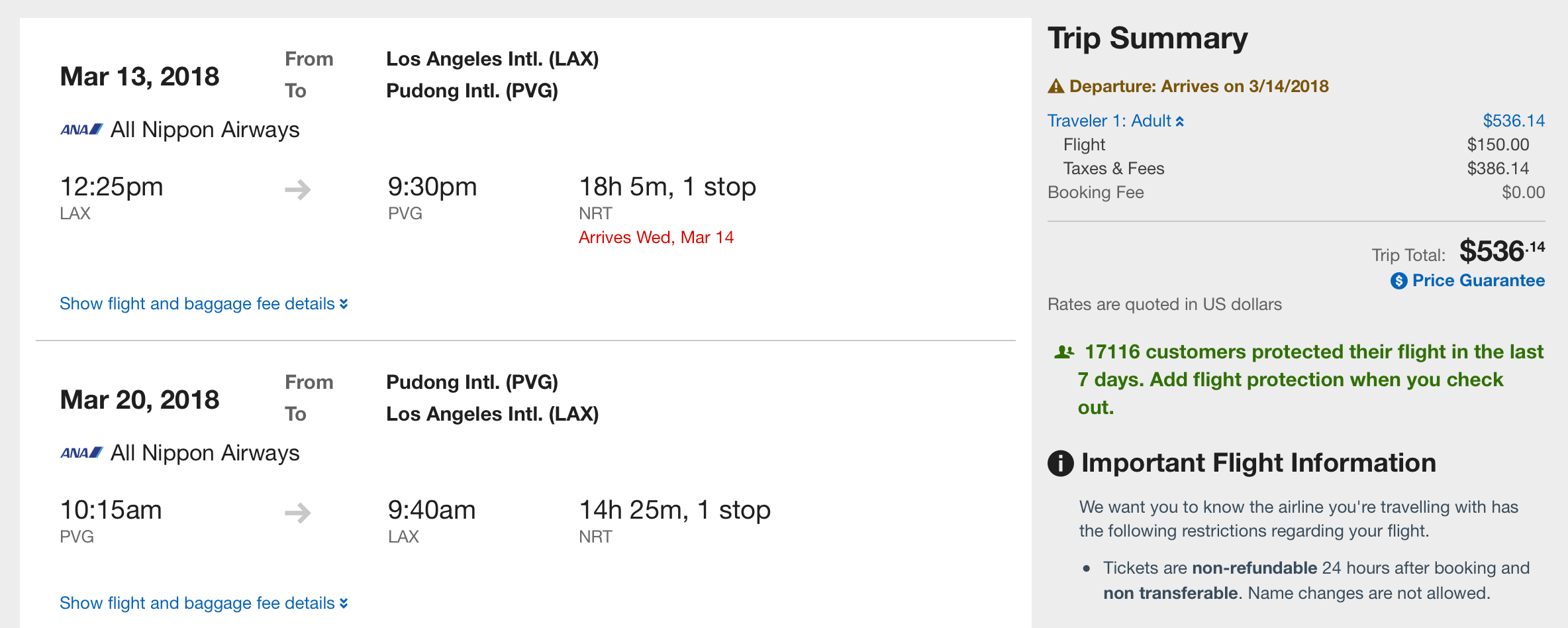 Los Angeles (LAX) to Shanghai, China (PVG) for $536 round-trip on ANA via Orbitz:
