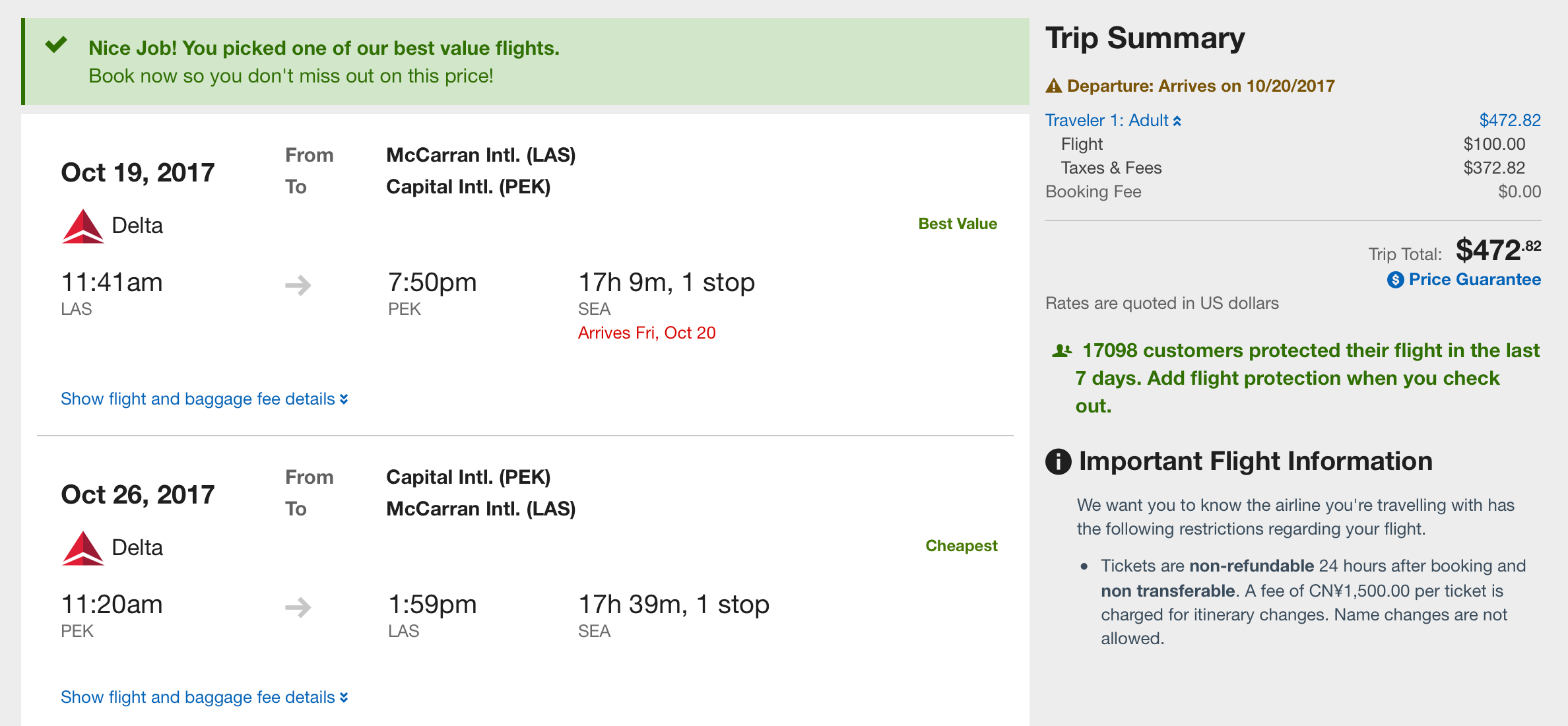 Las Vegas (LAS) to Beijing (PEK) for $473 round-trip on Delta via Orbitz: