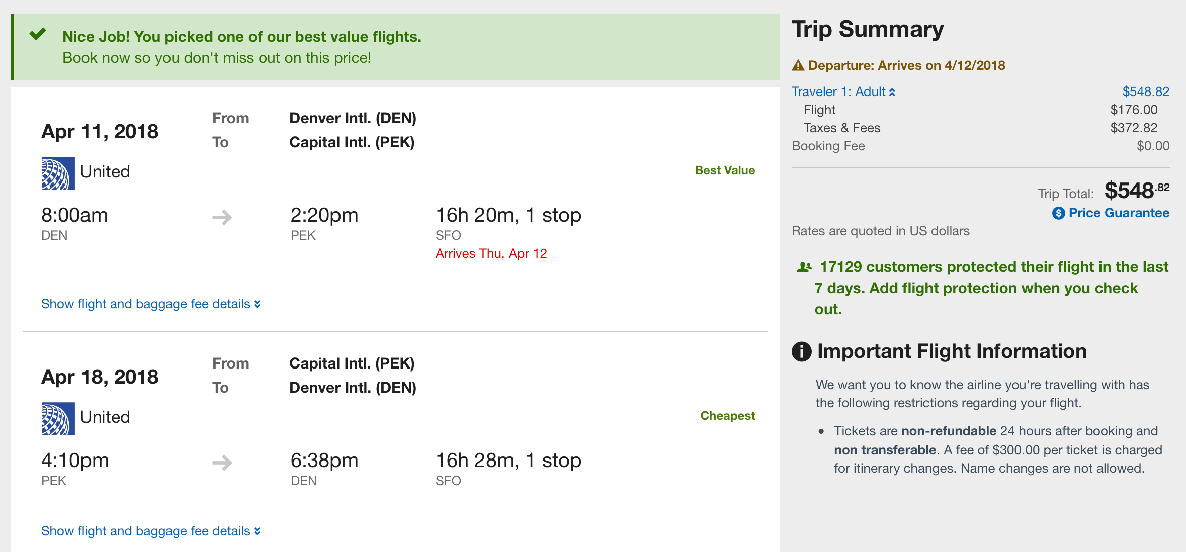 Denver (DEN) to Beijing (PEK) for $549 round-trip on United via Orbitz: