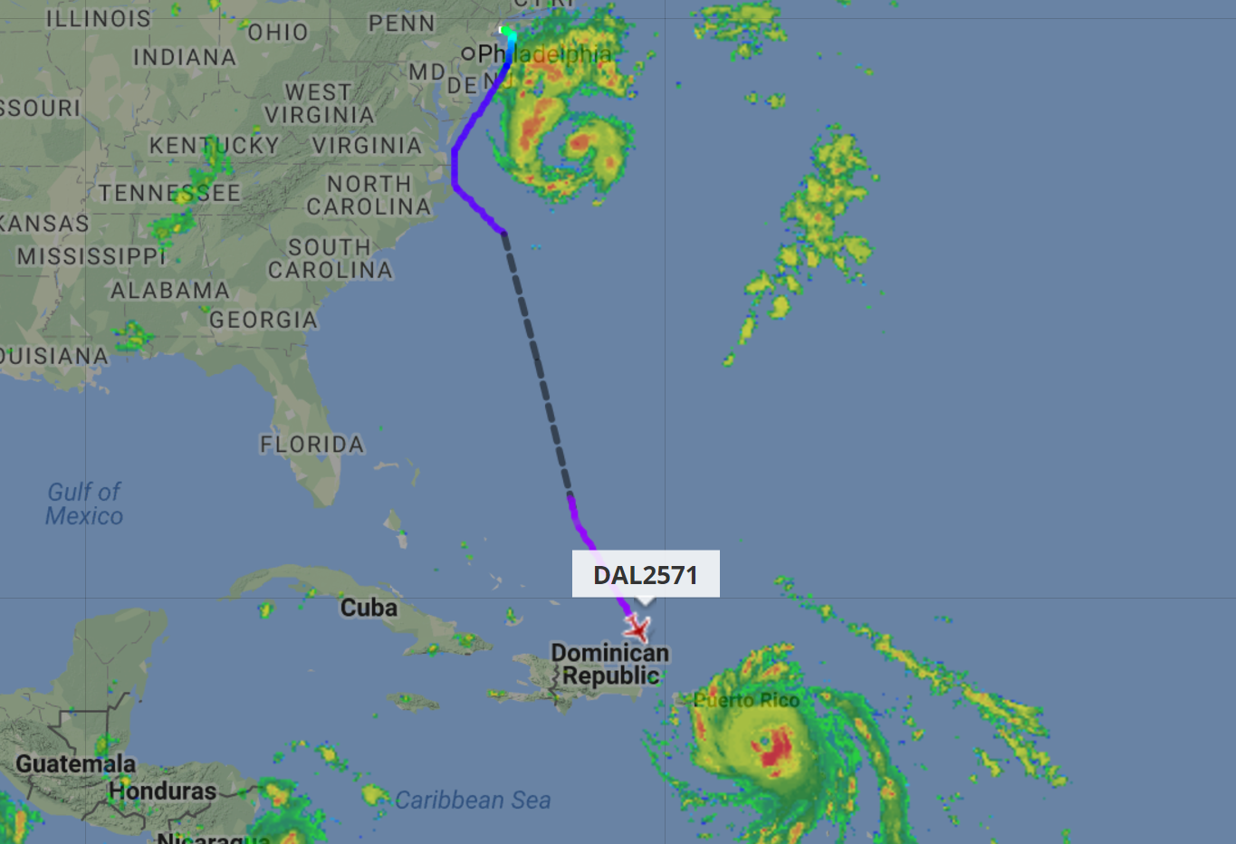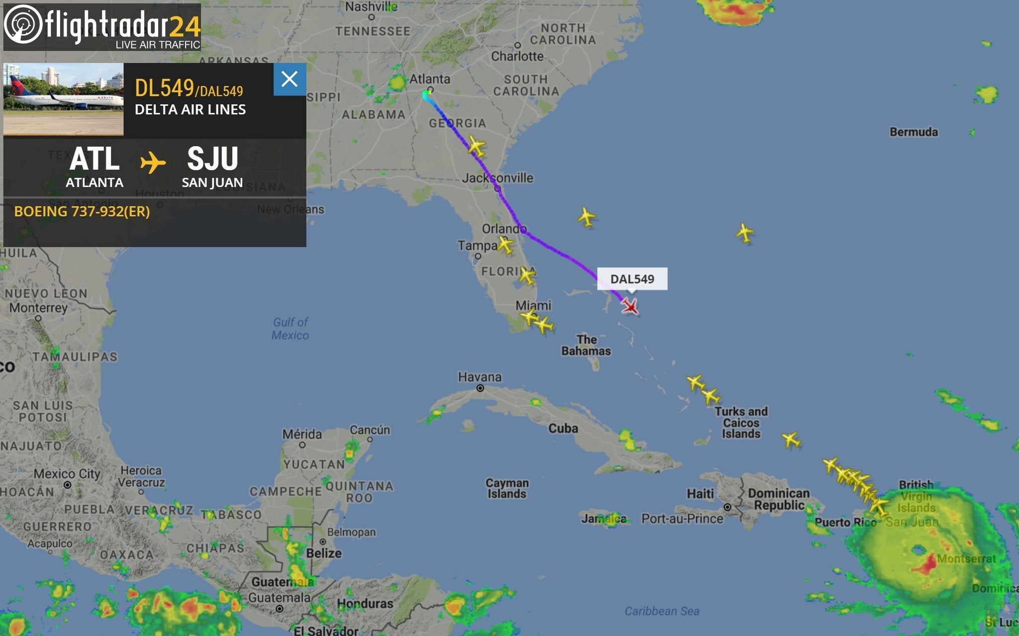 Delta flight #2571 was especially interesting, having to fly around Hurricane Jose on its way into the path of Category 5 Hurricane Maria: