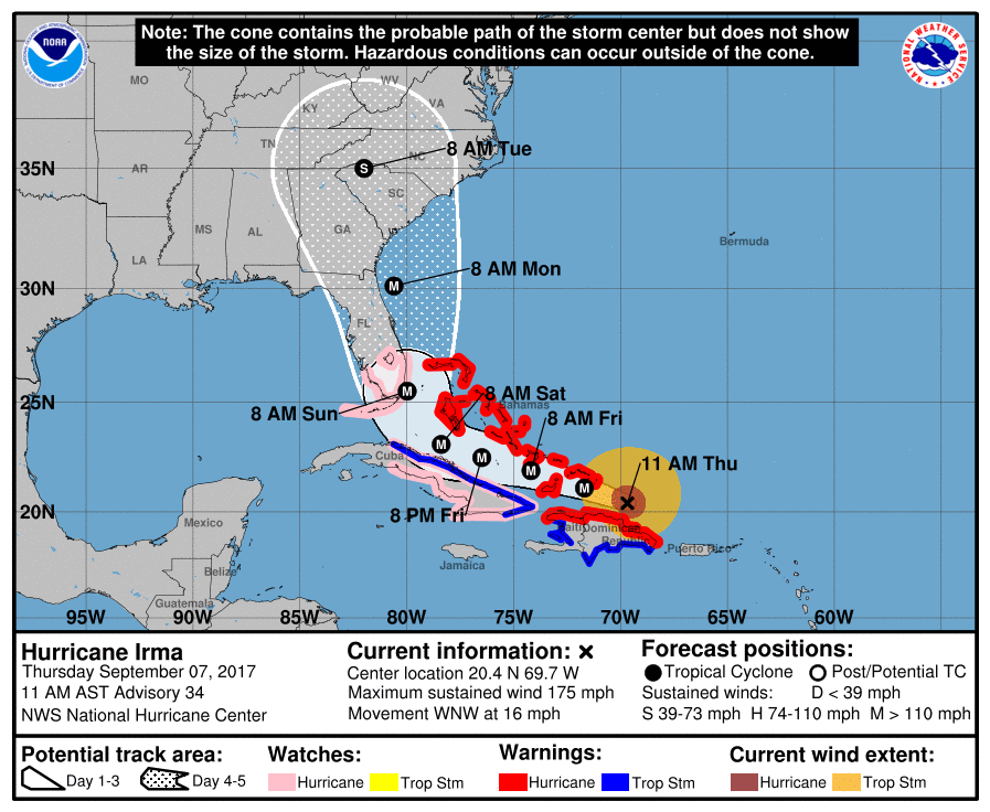 The incredibly destructive core of the monster storm remains compact; hurricane force winds still only extend outward 50 miles from the eye. Exactly where the core of the storm hits will make a significant difference. So, travelers and residents in the Bahamas, Cuba, Florida and northward into Georgia and the Carolinas need to keep a close watch on Irma.
