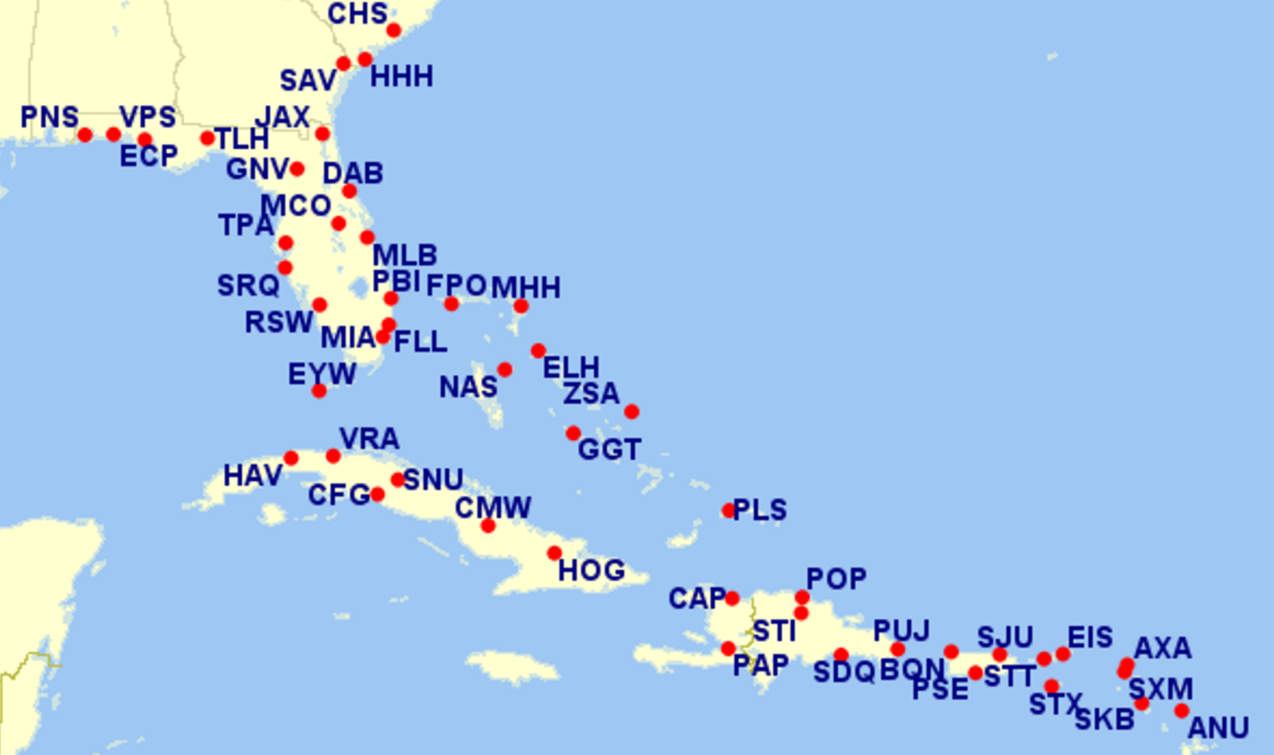 - Airports affected: Daytona Beach, FL (DAB); Fort Lauderdale/Hollywood, FL (FLL); Fort Myers, FL (RSW); Fort Walton Beach, FL (VPS); Freeport, BS (FPO); Gainesville, FL (GNV); Georgetown, BS (GGT); Havana, CU (HAV); Jacksonville, FL (JAX); Key West, FL (EYW); Marsh Harbour, BS (MHH); Melbourne, FL (MLB); Miami, FL (MIA); Nassau, BS (NAS); Orlando, FL (MCO); Panama City, FL (ECP); Pensacola, FL (PNS); Sarasota/Bradenton, FL (SRQ); Tallahassee, FL (TLH); Tampa/St. Pete/Clearwater, FL (TPA); West Palm Beach, FL (PBI)