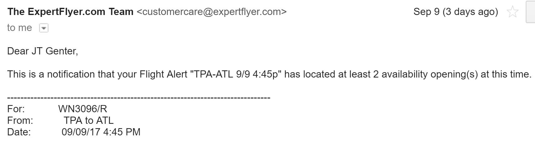 You might be surprised how many alerts you'll get. I set alerts for four sold-out Southwest flights from Tampa (TPA) to Atlanta (ATL) ahead of Hurricane Irma, and received alerts from ExpertFlyer for all four flights.