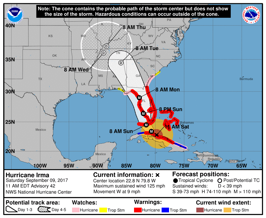 Irma made landfall in Cuba Friday night as a Category 5 hurricane. This makes it the first Category 5 hurricane to do so since 1924. While the Cuban landfall is terrible news for those in the area, it's a positive development for the residents of Florida, as the interaction with land has weakened the storm and broken up its previously superb organization. Top sustained winds have dropped to 125 mph as of 11am Saturday.