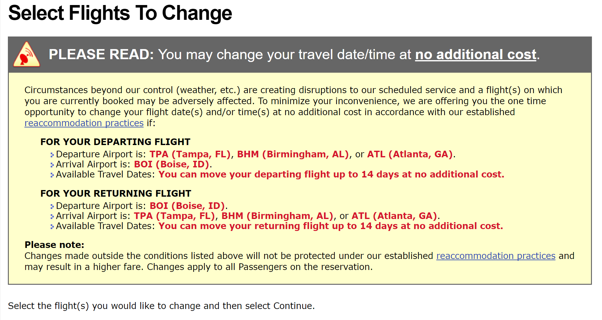 - Customers who are holding reservations for flights departing during these dates, and want to alter their travel plans may rebook in the original class of service or travel standby (within 14 days of their original date of travel between the original city-pairs and in accordance with Southwest's accommodation procedures) without paying any additional charge.