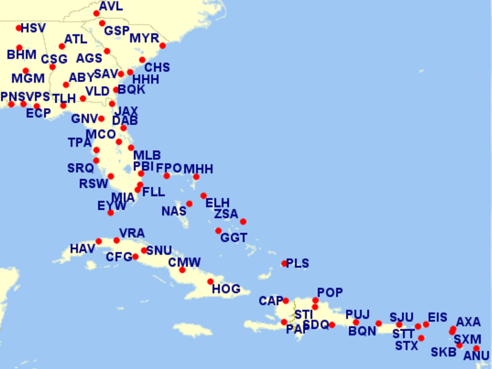 - Airports affected: Albany, GA (ABY); Atlanta, GA (ATL); Augusta, GA (AGS); Brunswick, GA (BQK); Charleston, SC (CHS); Columbus, GA (CSG); Daytona Beach, FL (DAB); Fort Lauderdale/Hollywood, FL (FLL); Fort Myers, FL (RSW); Fort Walton Beach, FL (VPS); Freeport, BS (FPO); Gainesville, FL (GNV); Georgetown, BS (GGT); Havana, CU (HAV); Jacksonville, FL (JAX); Key West, FL (EYW); Marsh Harbour, BS (MHH); Melbourne, FL (MLB); Miami, FL (MIA); Nassau, BS (NAS); Orlando, FL (MCO); Panama City, FL (ECP); Pensacola, FL (PNS); Punta Cana, DO (PUJ); Sarasota/Bradenton, FL (SRQ); Savannah, GA (SAV); St. Maarten, SX (SXM); San Juan, PR (SJU); Santiago, DO (STI); St. Croix, VI (STX); St. Thomas, VI (STT); Tallahassee, FL (TLH); Tampa/St. Pete/Clearwater, FL (TPA); Turk Caicos ISLS, TC (PLS); Valdosta, GA (VLD); West Palm Beach, FL (PBI)