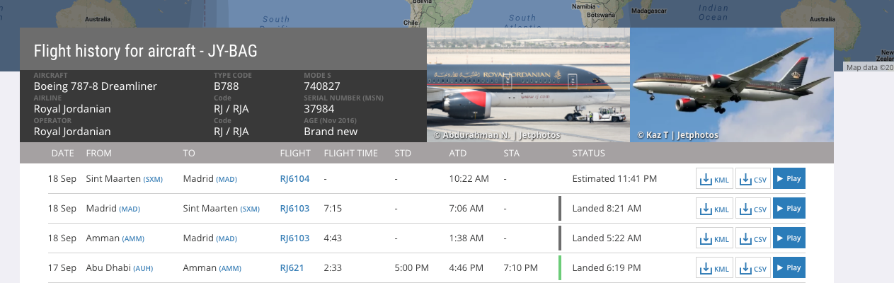 At the time of this writing, RJ Flight 6104 is en route to Madrid and is expected to arrive at 5:36pm ET. Royal Jordanian does not regularly operate flights to SXM.