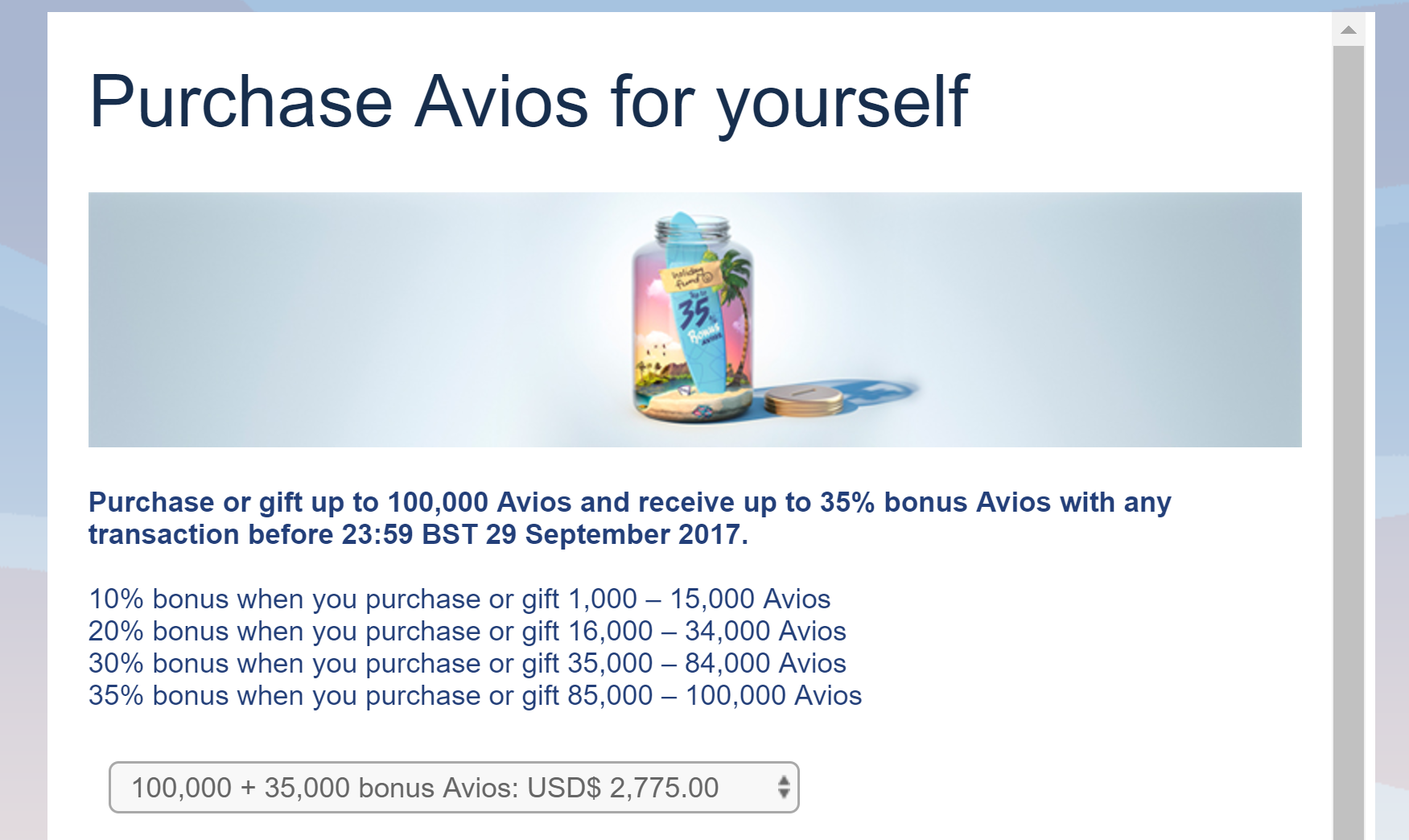 London-based carrier British Airways is offering a buy miles promotion that lets you receive up to a 35% bonus in purchased miles when you buy up to 100,000 Avios. Note that it's only available through September 29, 2017.