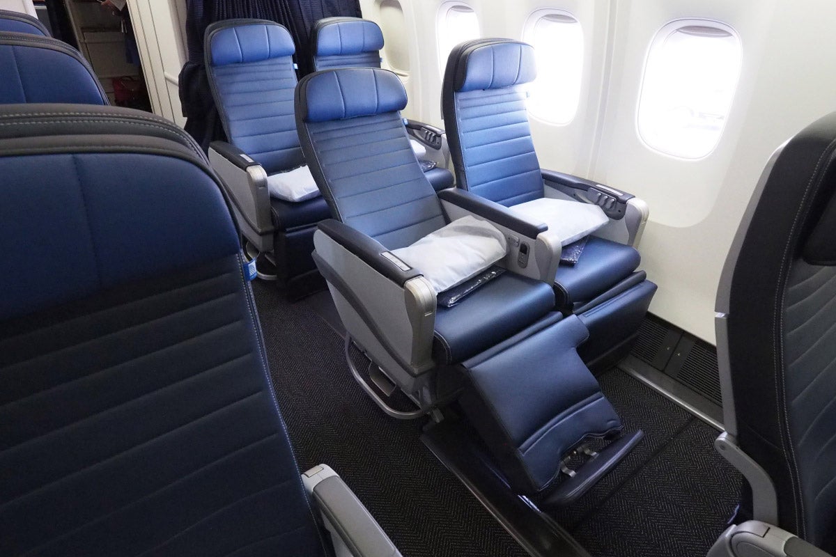 Oddly, there are two sets of Economy Plus seats in the rear — they're reserved for resting flight attendants on longer flights, but you can select them on shorter flights, such as the eastbound crossing to London.
