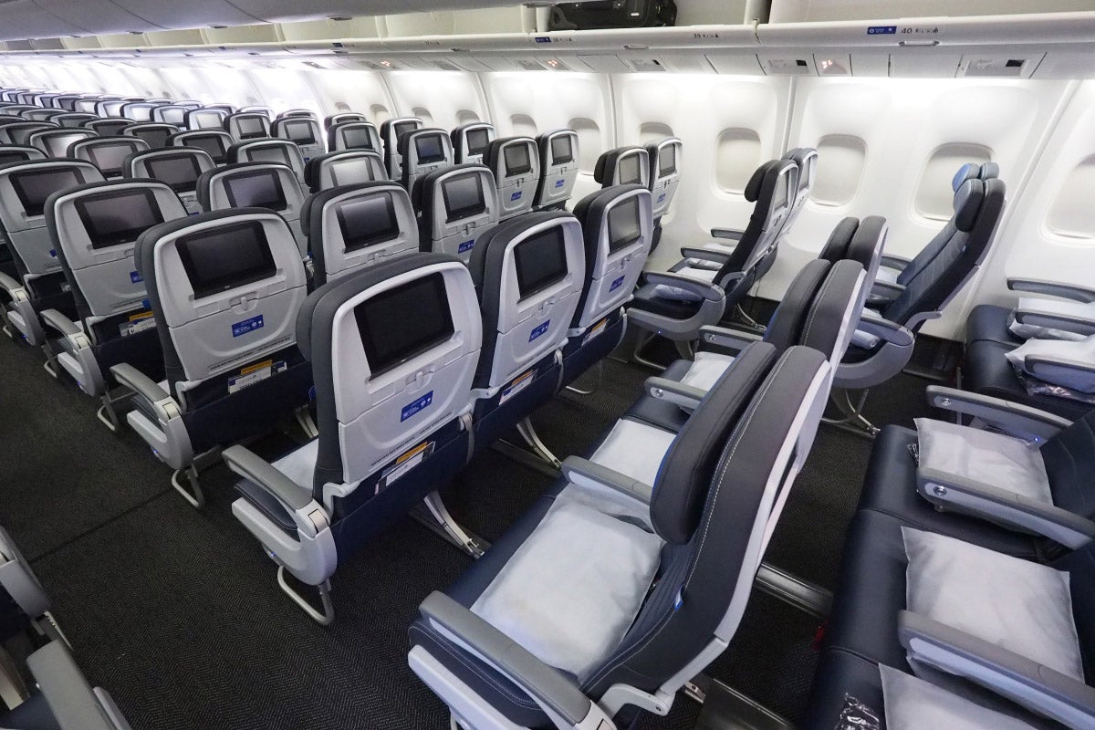 These planes offer a much more comfortable ride in economy — unlike with the 777-300ER, where seats are arranged in a 3-4-3 configuration and measure just 17 inches wide, the updated 767s maintain the 2-3-2 configuration, with each seat offering a whopping 18.5-inch width, making this the largest economy seat in United's entire fleet.