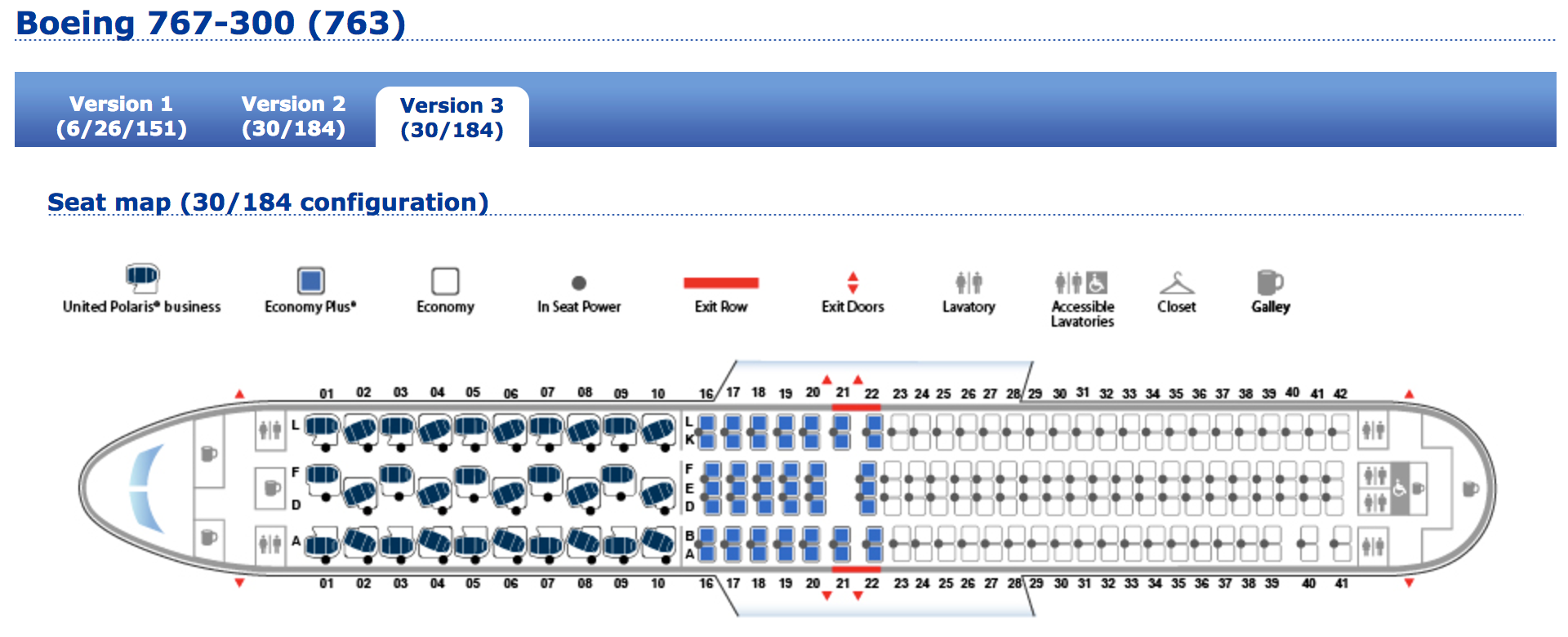 Until today, United operated three versions of the 767 — one 767-400ER model, with 39 business-class seats in a 2-1-2 configuration, and two 767-300 versions, including one with six first-class seats and 26 biz seats in a 2-2-2 configuration and one with 30 business seats in a 2-1-2 arrangement, pictured below: