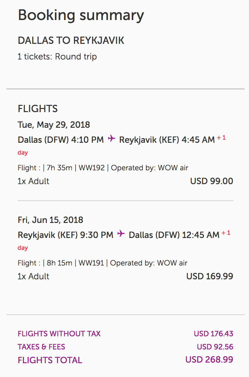 - WW191 Reykjavik (KEF) 9:30pm Departure ⇒ Dallas (DFW) 12:45am Arrival