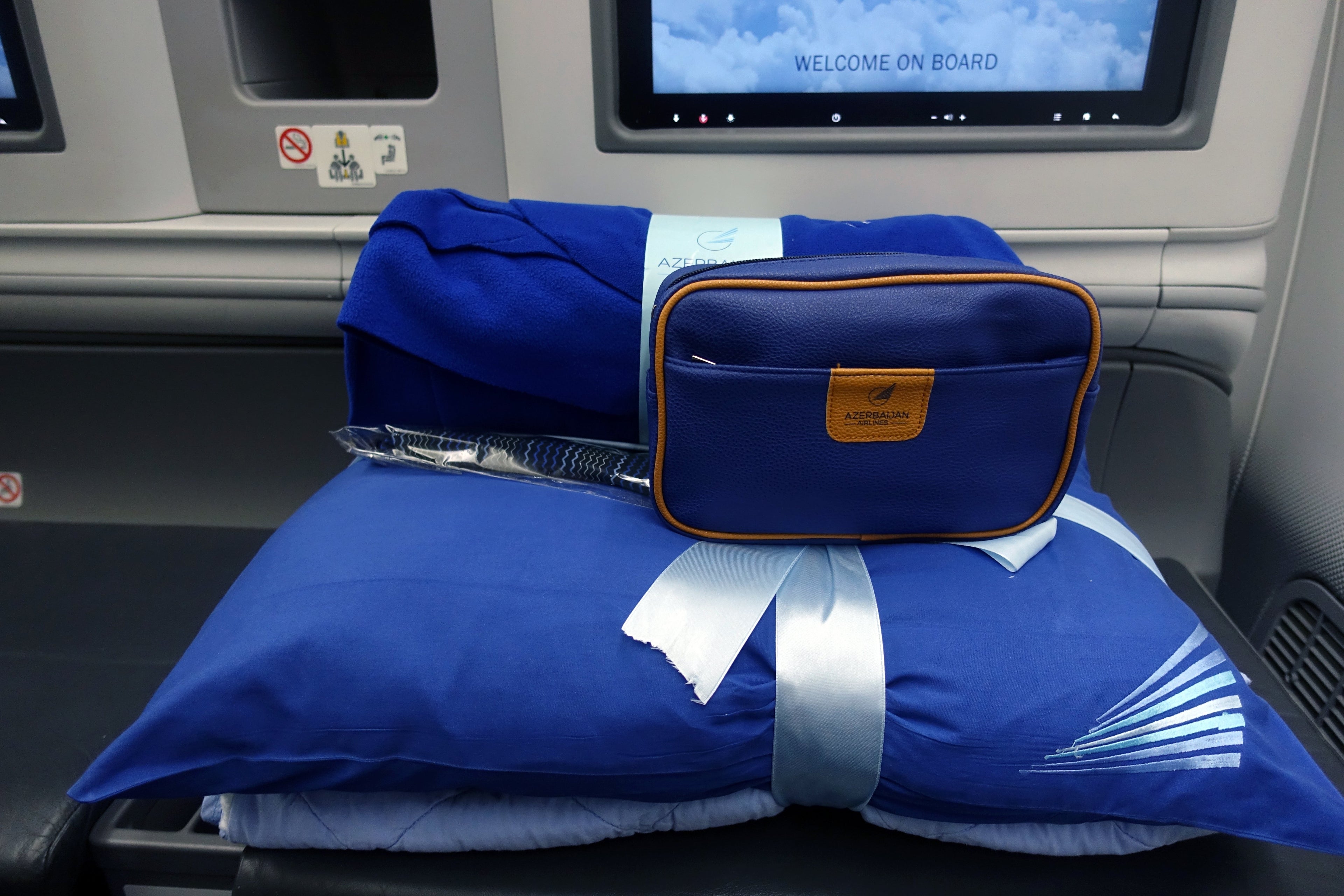 Each business-class passenger was greeted on board with an selection of amenities In it, there was a fleece, AZAL-branded blue blanket, a large pillow, mattress pad, set of pajamas and amenity kit. I found the pajamas, which had a very fun chevron design, to be cute and comfortable. The blanket was very long, which is great news for taller passengers. Aside from the amenity kit itself, the highlight of the on board amenities was the pillow. It was the largest pillow I've gotten on a plane, and it was padded perfectly and very comfortable.