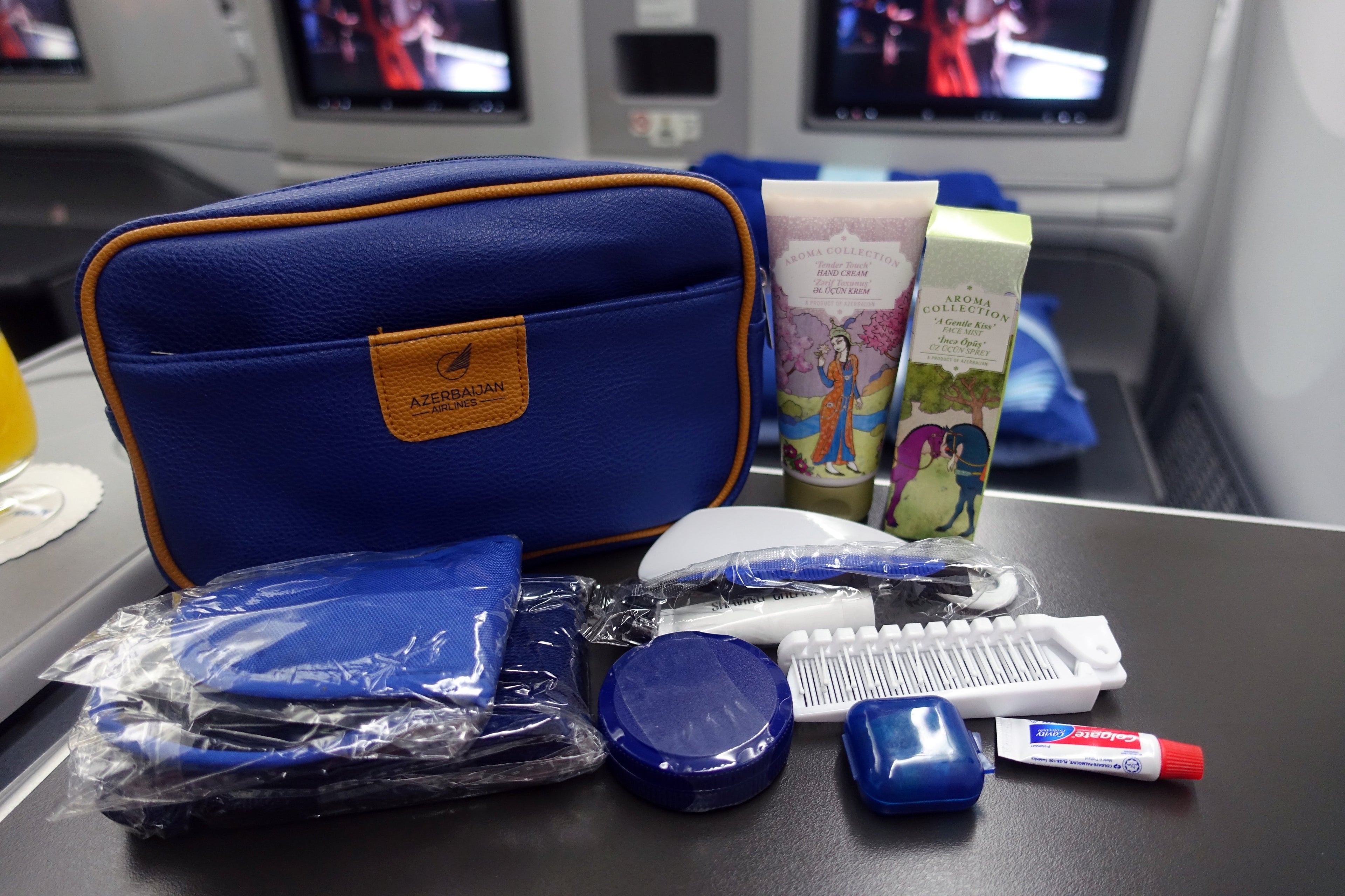 The amenity kit was also a highlight of the on board experience. It was deep blue in color with a brown trim and leather in composition. Inside there were the standards — eyemask, socks, earplugs and a dental kit. But there were also some added amenities — a hairbrush, mirror and large containers of Azerbaijani hand cream and face mist.