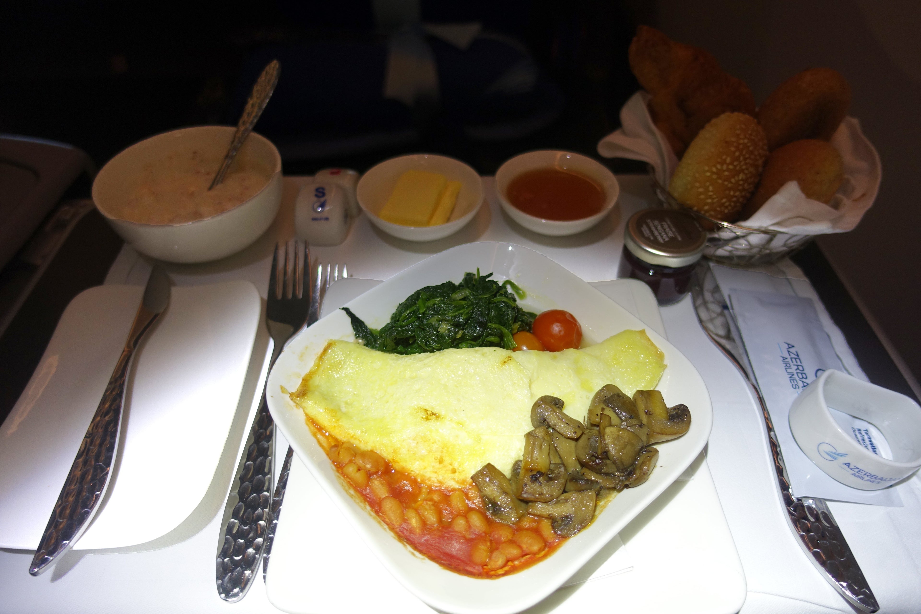 Flight attendants also passed around two menus before takeoff — a food menu and a drink menu. Since the flight departed Baku at 5:00am, breakfast was the first meal offered. The breakfast menu consisted of eight different choices for cold appetizers, which were later served in person and required no pre-selection.