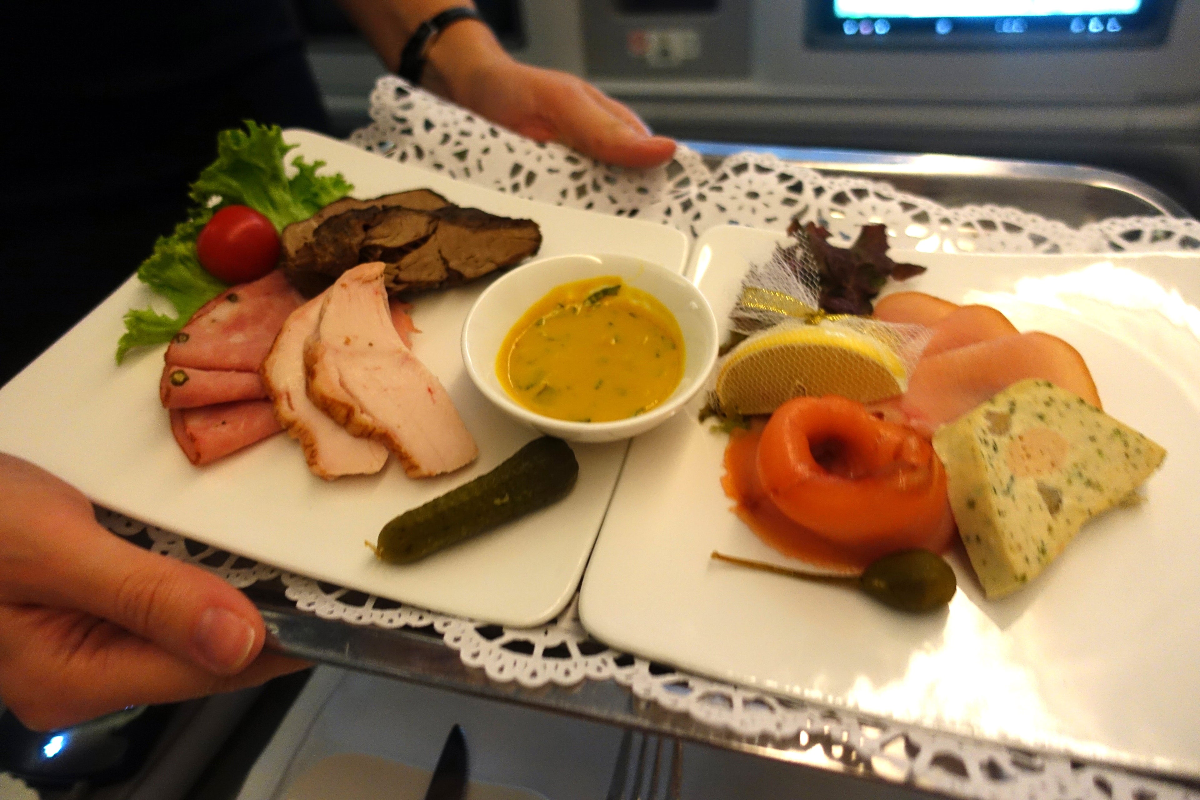 I ordered the omelet, which was just OK. There was a lot of cheese inside, and the mushrooms, spinach, tomato and beans were all tasty sides. Of the eight choices for cold appetizers, flight attendants came around offering only five of them, already plated. I was offered a choice of muesli or cottage cheese and sour cream, and I chose the muesli, which was very tasty. The other choice included caviar with pancakes, a foie gras plate and cold cuts — I didn't opt to try any of them. During breakfast, each passenger also got their own bread basket, which is a really nice touch, giving you plenty of choices.