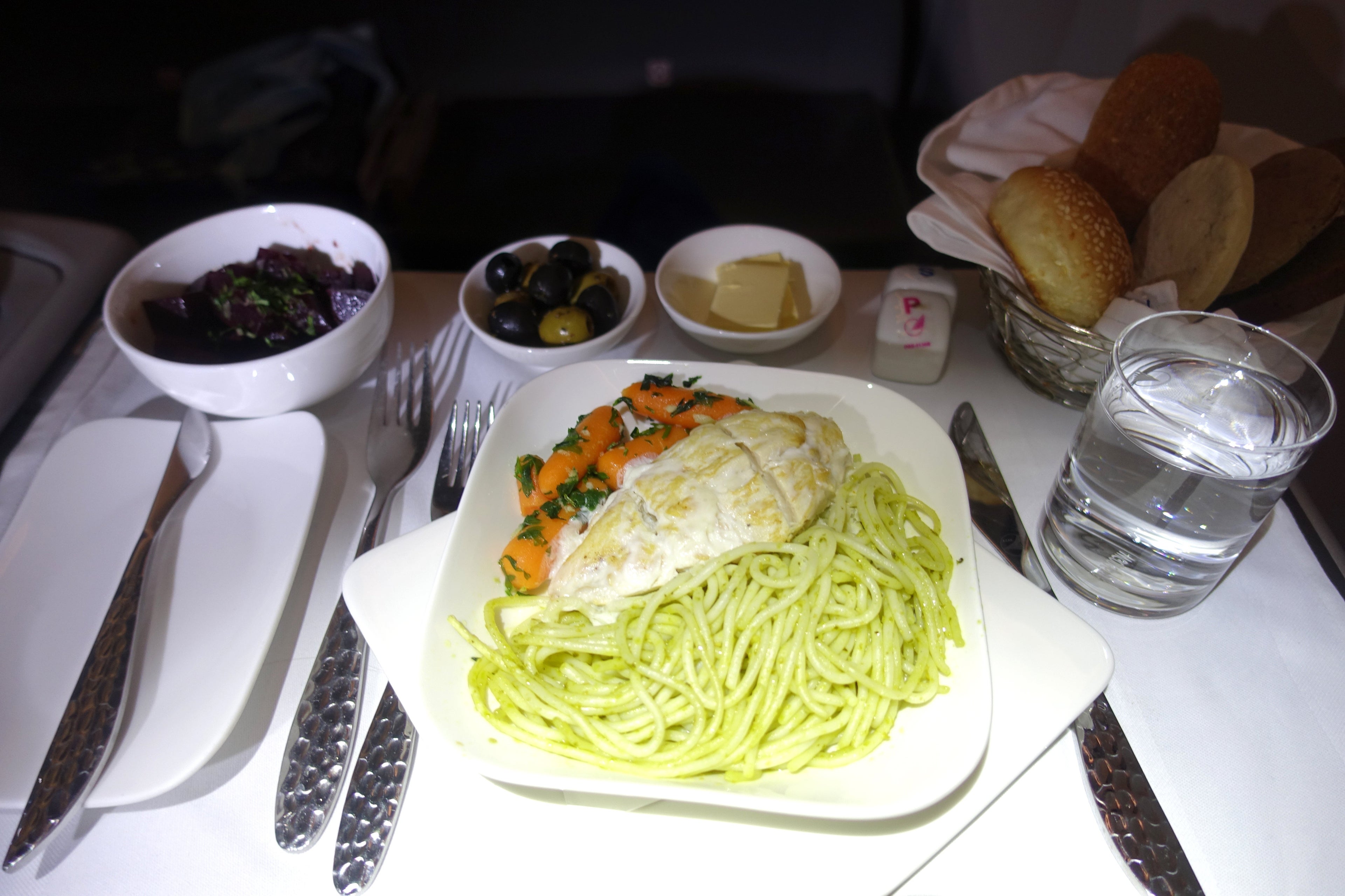 Like with breakfast service, flight attendants went around the cabin to each passenger with individually plated cold appetizers — this time, only five of the seven options were offered. I ended up getting the Lebanese beetroot salad with a mustard topping and chopped parsley, as well as assorted marinated olives. Both were very tasty.