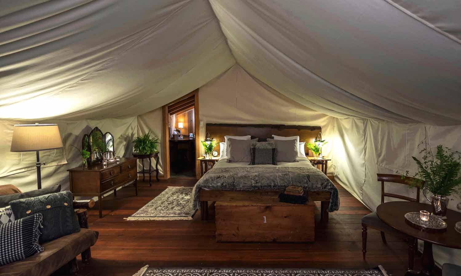 An "en-suite tent" at this British Columbia resort comes with a king-sized bed, private deck and laundry service, but the en-suite bathroom is the real star of the show. Along with spa slippers and robes, it features double sinks, a private outdoor covered shower and a heated floor. Glampers can choose between waterfront, rainforest and sunrise tents, and inside, the light selections alone spell out luxury — vintage oil lamps, candles set in antique silver and crystal and, of course, electric light. Guests have access to their own remote-controlled, propane-fueled, cast-iron wood stoves, while dishes like crab ravioli and Cornish game hen make an appearance on the resort menu. In the event guests need additional relaxation, the resort spa offers both hot stone and deep tissue massages. All-inclusive rates from $1,283–$2,005 per person per night for a three-night package. Four- and seven-night packages are also available.