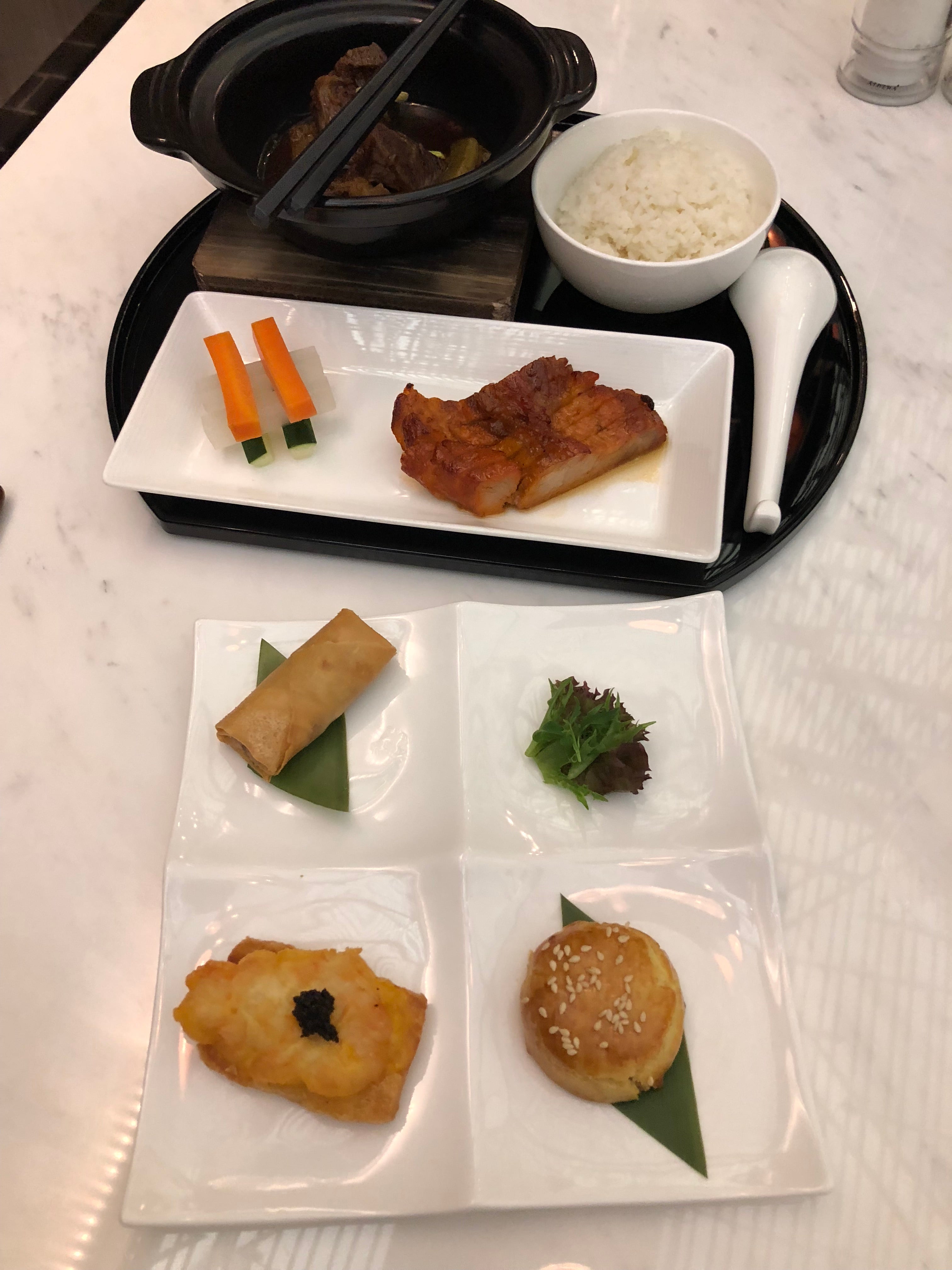 In this part of the lounge, you can expect to find even more amenities than there are in the regular lounge (yes, it's possible!). There's a complimentary à la carte menu designed by Michelin-star chef Lau Yiu Fai of Yan Toh Heen at the InterContinental Hong Kong. Everything I tried was delicious. The main part of the lounge also offers buffet-style options with both locally inspired Asian dishes like a dim sum breakfast, as well as Western classics like gnocchi Pomodoro.