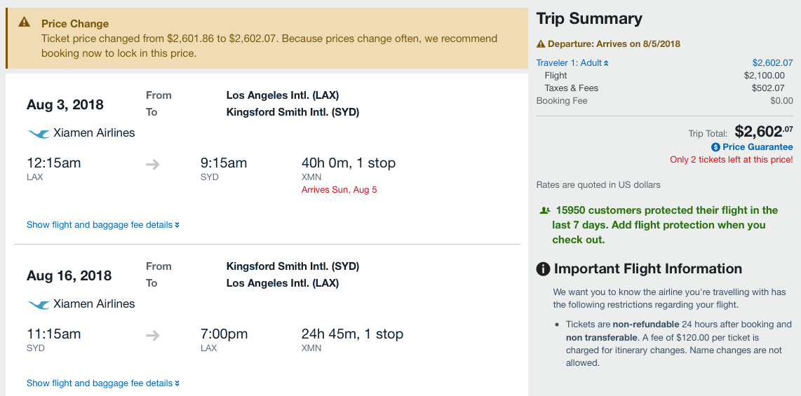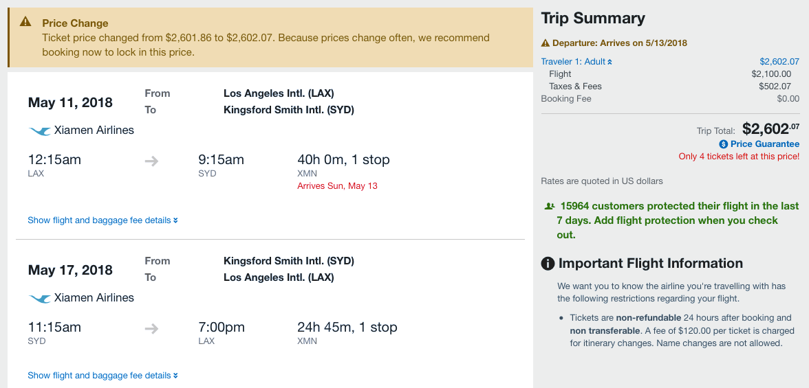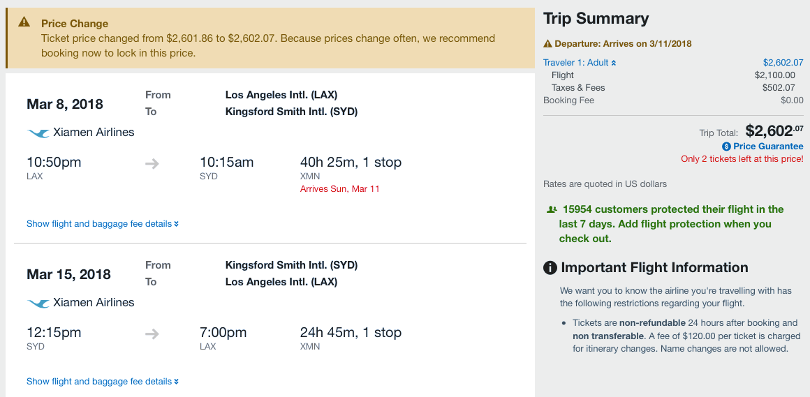 Even though most of these options require an overnight in Xiamen (XMN) on the way to Sydney, you shouldn't need a visa thanks to China's "visa-free transit" policy since these itineraries continue onwards to a third country (in this case, Australia). But if you do want to stay in China longer than 72 hours, be sure you get the right visa before traveling or you won't even be able to get on the plane. TPG recommends using a third-party service like Allied Passport & Visa; mention The Points Guy on your order form and receive a discount.
