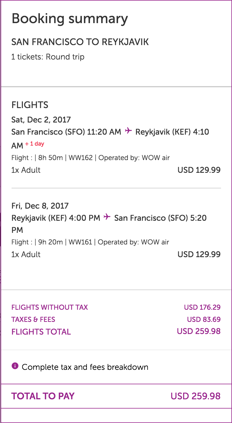 San Francisco (SFO) to Reykjavik (KEF) for $260 round-trip:
